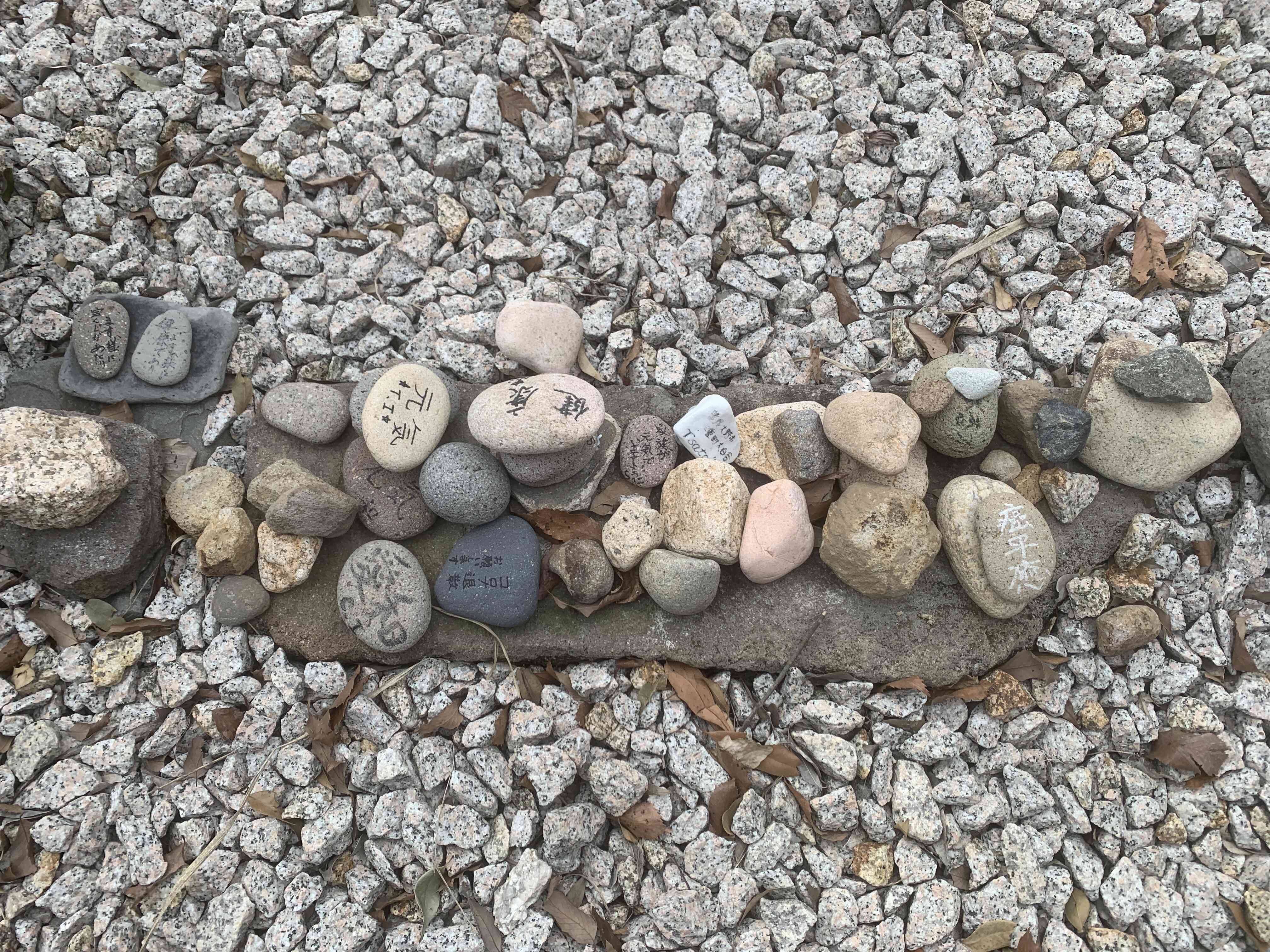 2021年の設置当初は島袋らが用意した石のみだったが、「石を持って山に登る」というインストラクションに導かれて、現在は来訪者が持ち寄った様々な土地の石が集まりつつある。石を拾う、持ち歩く、置く、という人の行為はごく単純なものだが、長い時間を経て、その集積はひょっとしたら願掛けや祈りのための新しい習慣になっていくかもしれない。未来における不特定多数の人々の行為は、大地やこの土地に賑わいをもたらす贈り物になりえるだろうか。