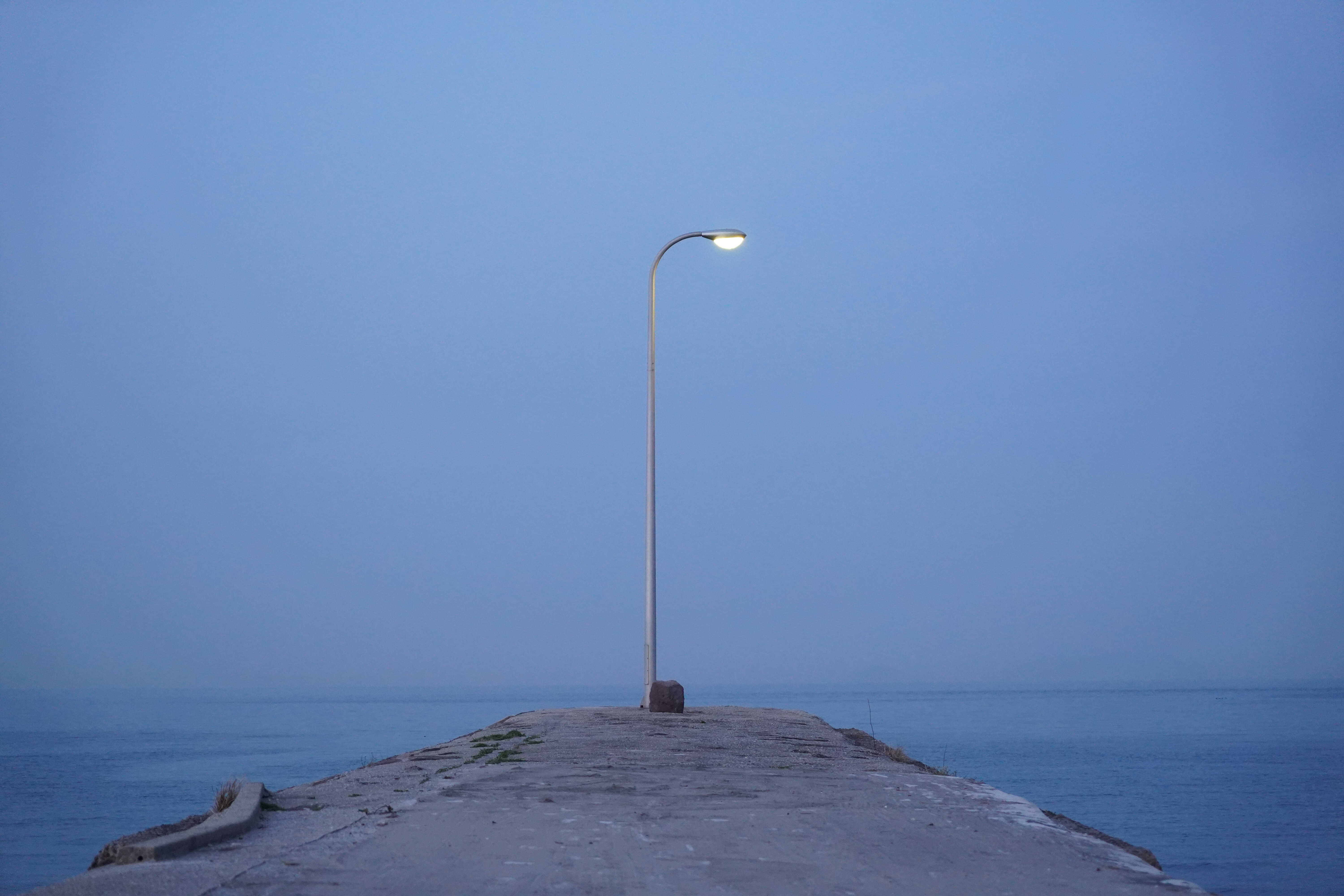 隠れキリシタンにゆかりのある岐部地区に2014年に設置された川俣正の《説教壇》に立ち寄ったあとは、本日最後の目的地である来浦(くのうら)地区。ここに設置された島袋道浩の《息吹》は、約20年間壊れたまま放置されていた堤防の灯を蘇らせた作品。夕陽の落ちる時間になると、人間の呼吸のようなリズムで電灯の灯が瞬く。