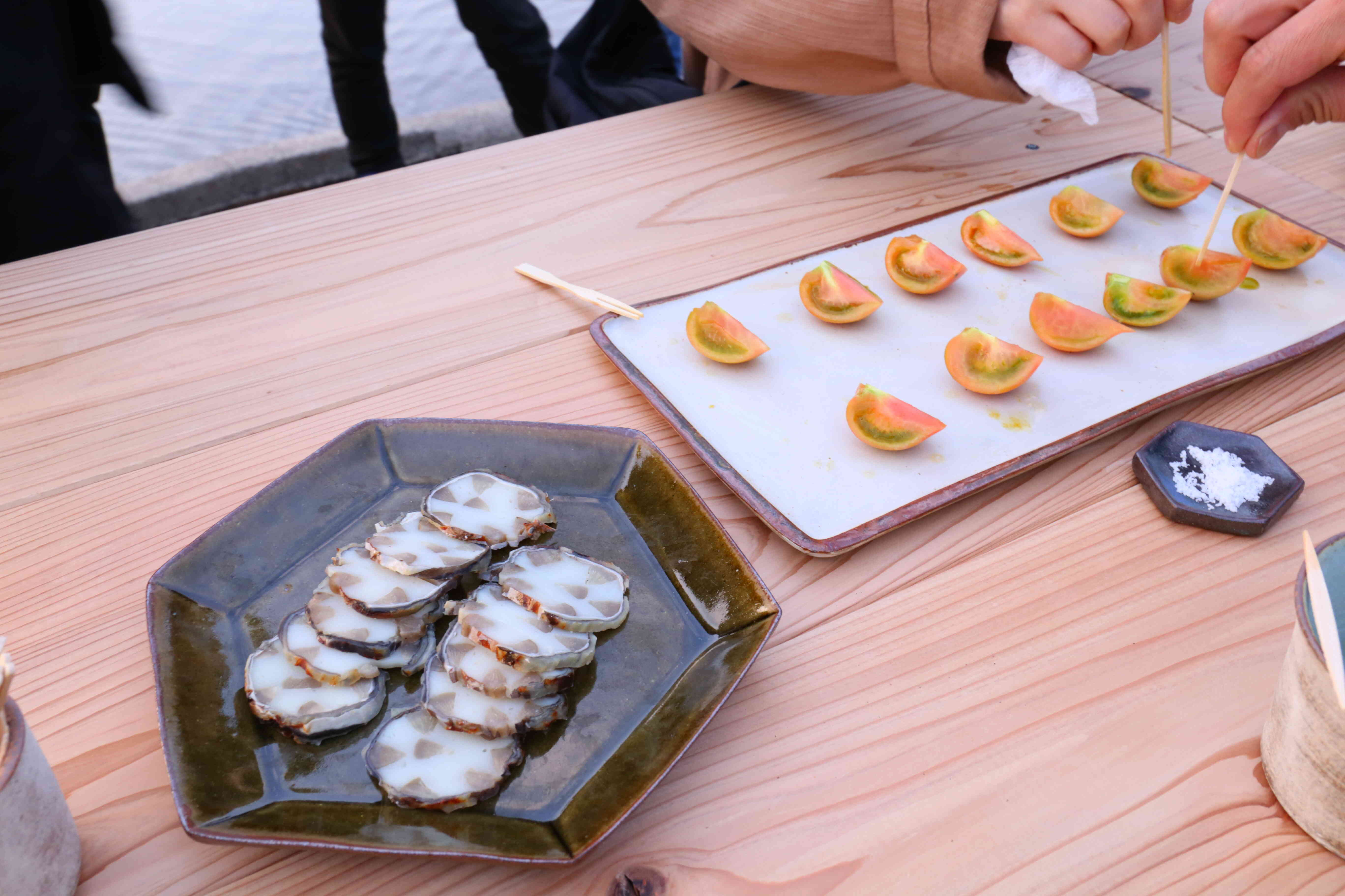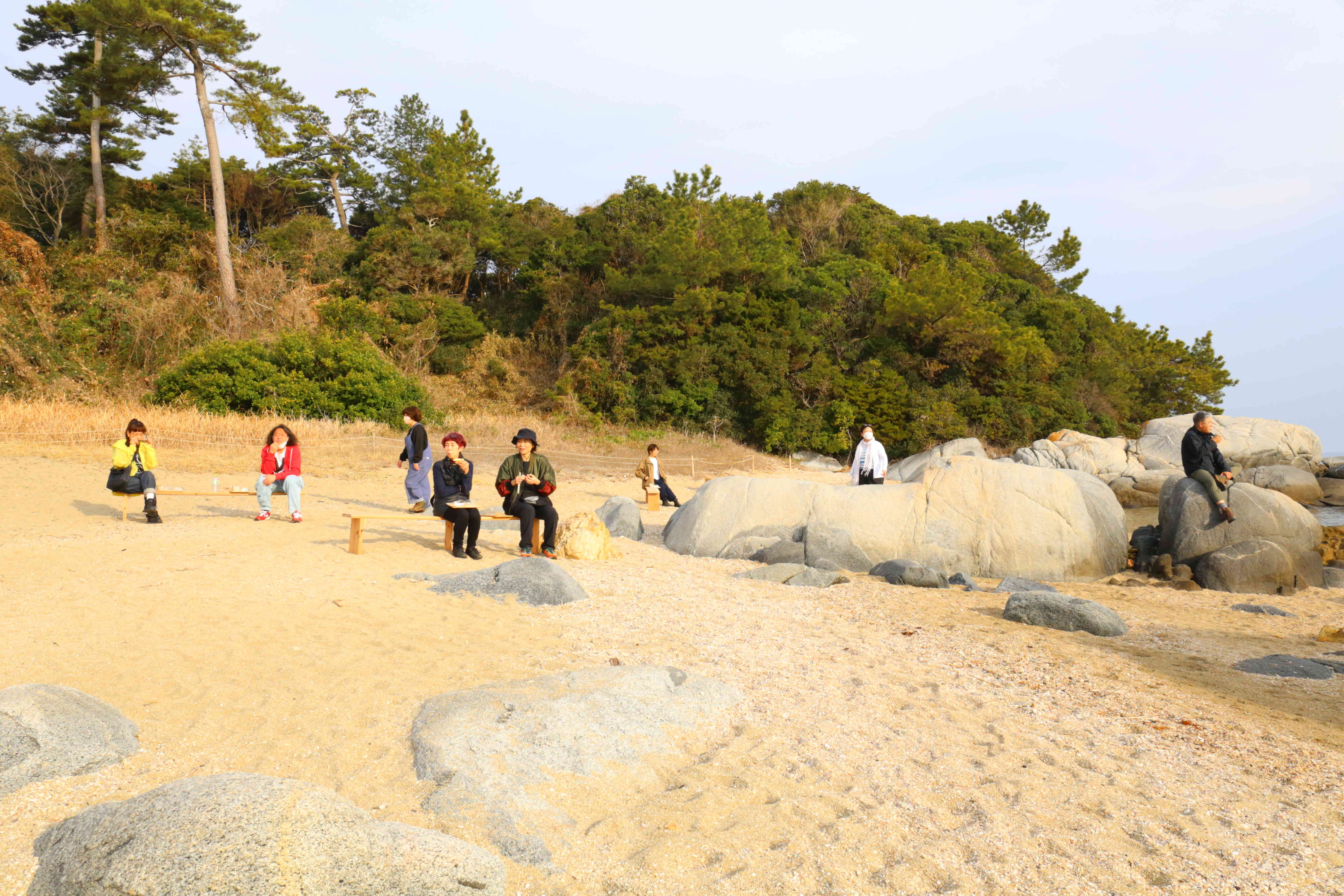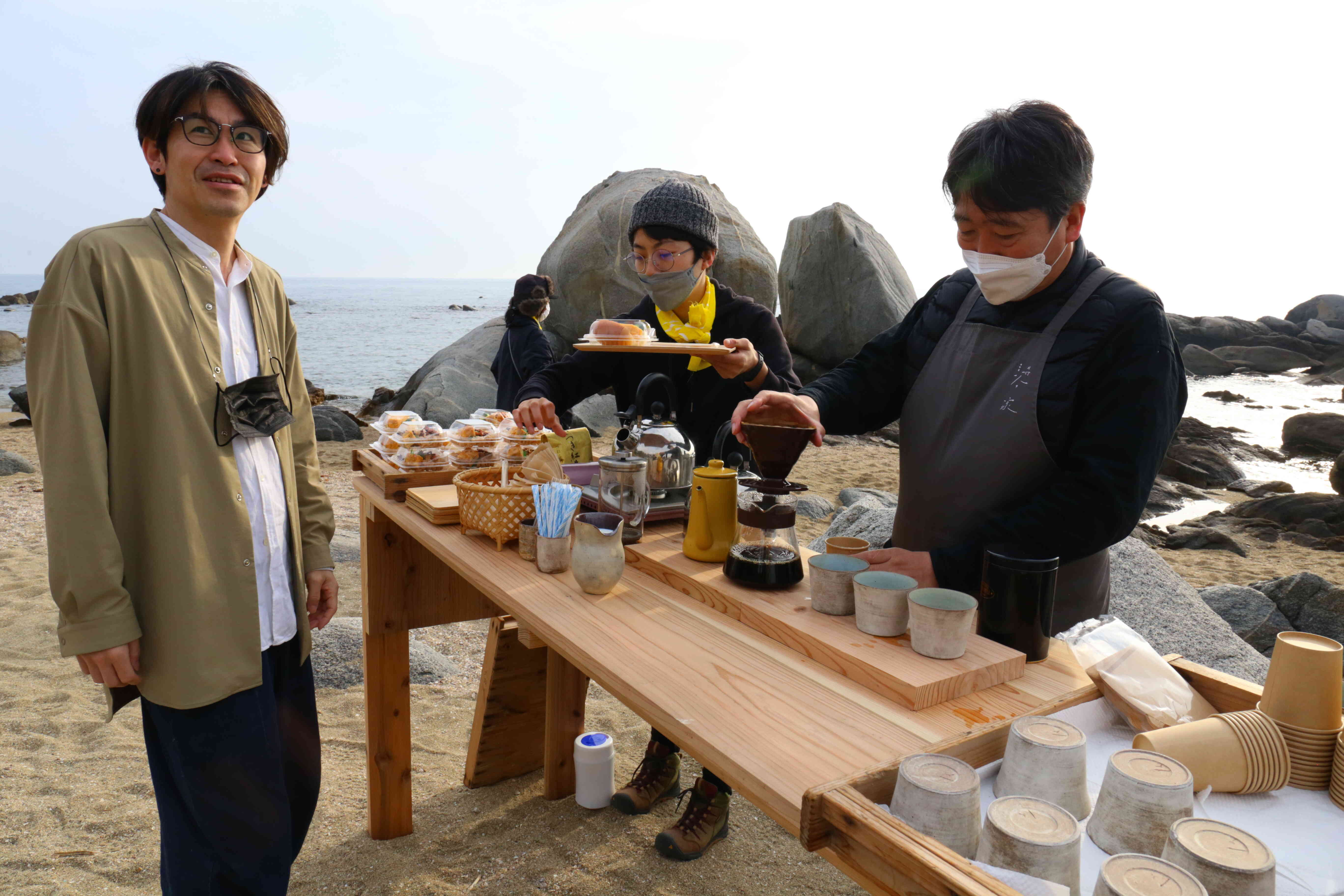 ここでは参加者への贈り物として、大分の名酒「西の関」の古酒、そしてつまみとして奥松農園の塩トマト、地元のはもの皮巻きが振る舞われた。さらにお酒を注いだ湯呑みは、島袋が地元の陶芸工房である「くにさきかたち工房」と一緒につくった特製だ(のちにこれも旅のお土産として参加者に贈られた)。ウィスキーや紹興酒を思わせる酒の深く甘い味と、それを引き立てる地元の味。寄せては返す波もまた「息吹」のようなリズムとなって、心地よい夕暮れに花をそえる。