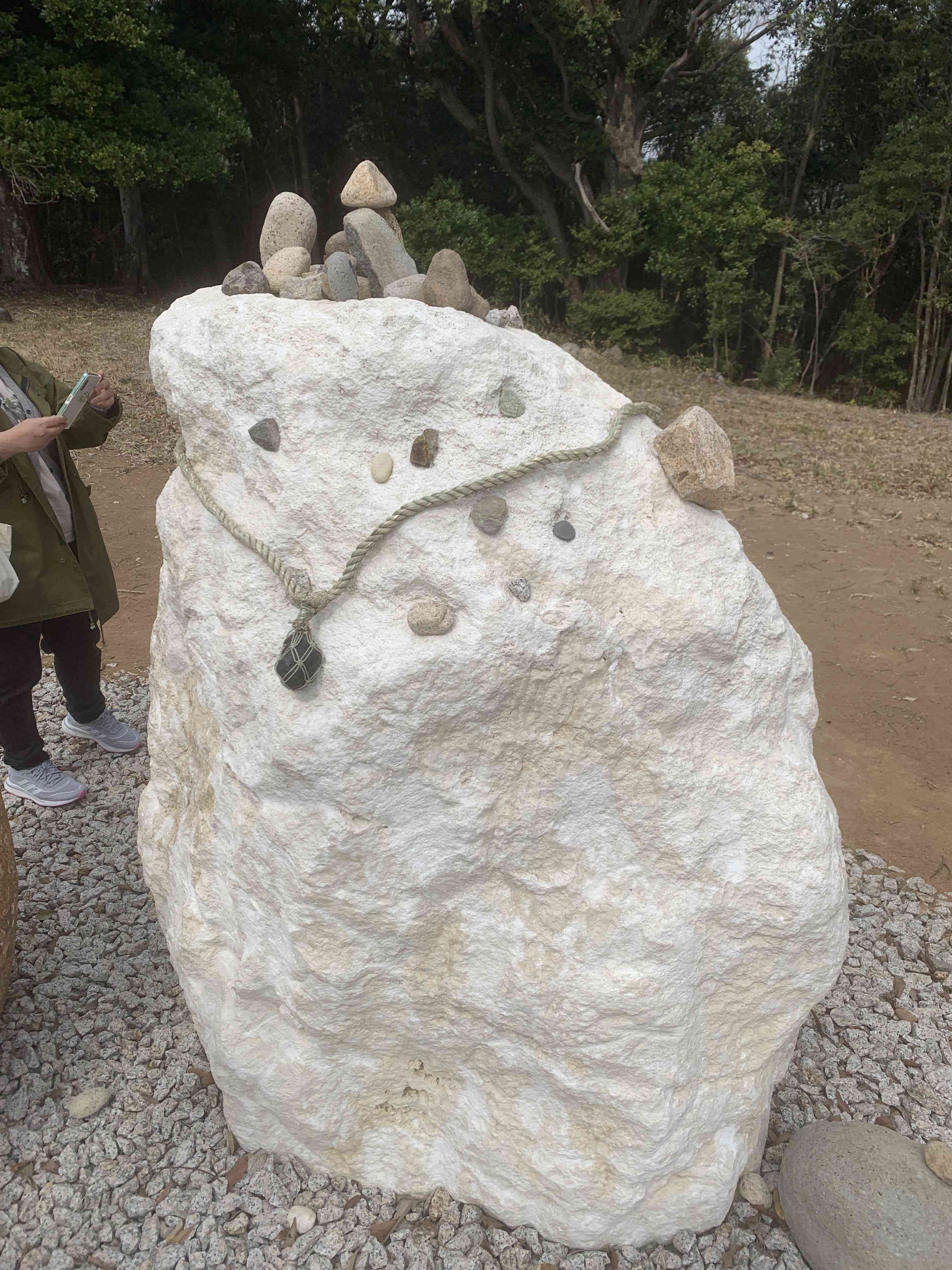 階段のない参道を登るのはなかなかハード。参加者全員がぜぇぜぇ言いながら5分ほどかけて登り切ると環状列石が見えてくる。これが《首飾りー石を持って山に登る》。沖縄や瀬戸内、北海道など全国から集められ円環状に並べられた大小の石群はたしかに大地に贈られた首飾りのようだ。さらにガイドスタッフと島袋は、隕石と沖縄発祥で現在は国東半島でのみ生育される植物・七島藺(しっとうい)でつくったという大きなネックレスを石のひとつにかける。このネックレスは、地元の人たちに管理を委ねており、特別な行事のたびに借り出すことになっているのだという。