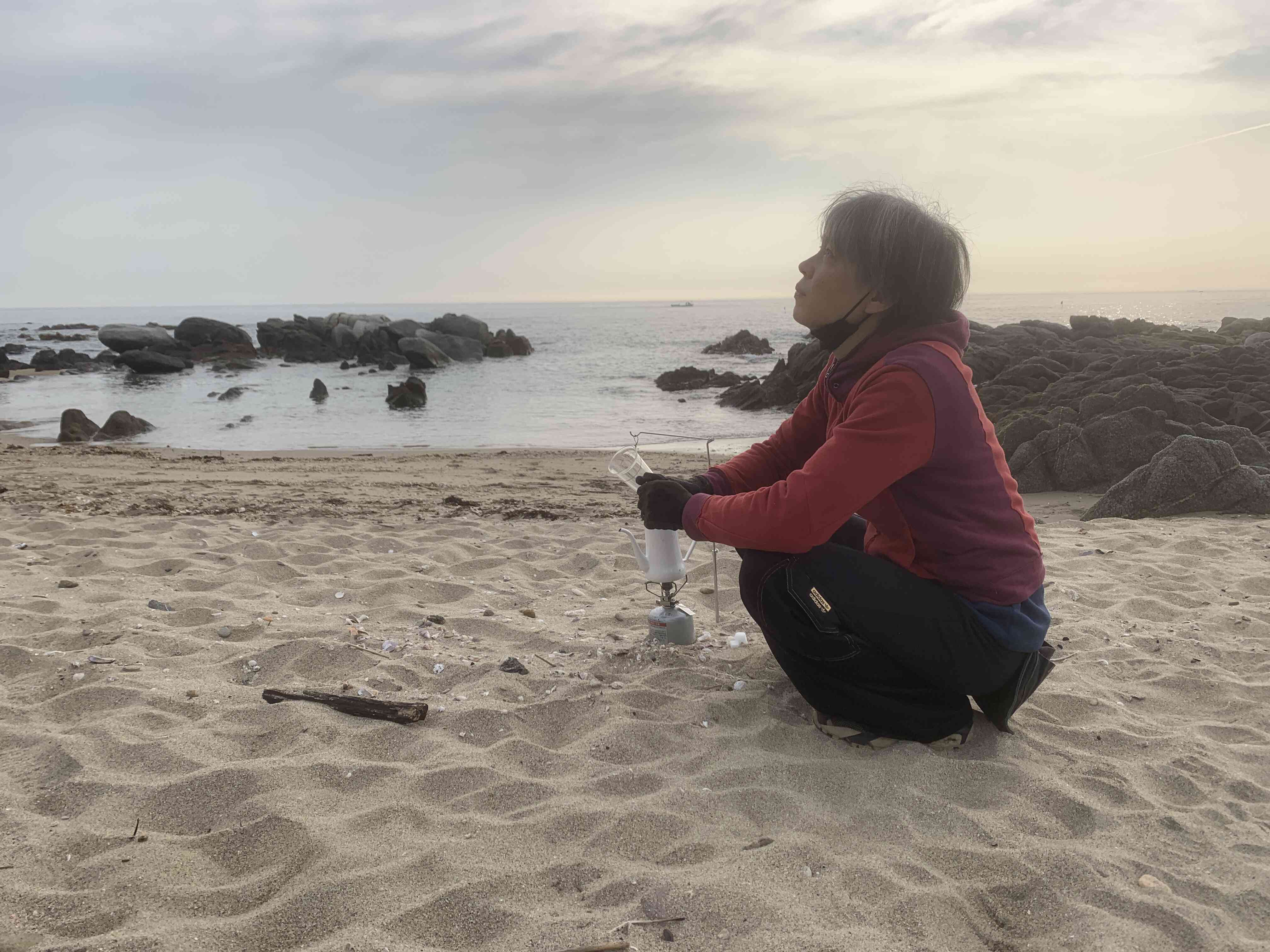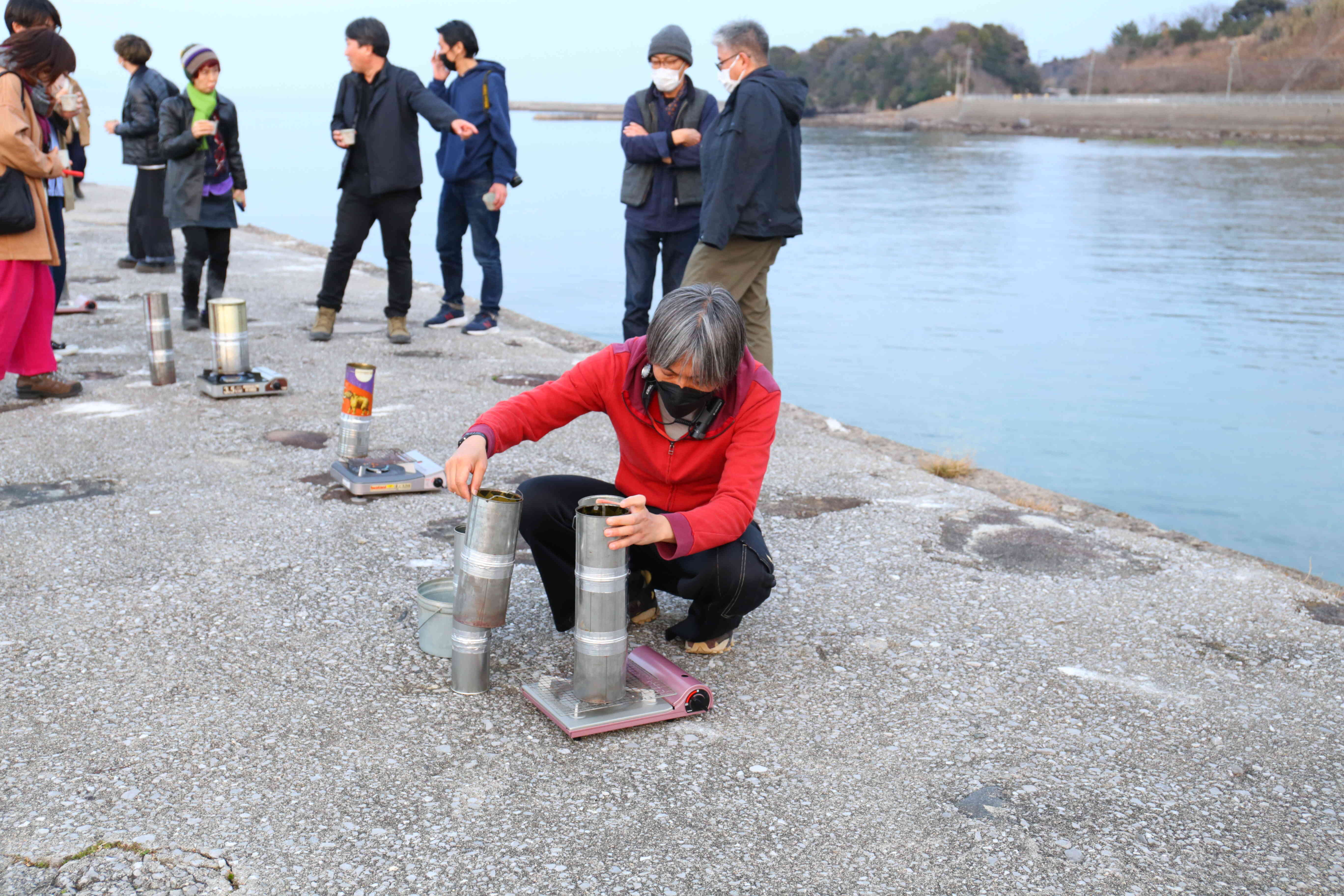 ここでのスペシャルな贈り物はこれだけではなかった。どこからともなく現れたのはアーティストの梅田哲也。日用品や光や水を使ったインスタレーションで知られる彼は、ここでカセットコンロと長さの異なる円筒形の缶を使った即興のパフォーマンスを行った。米と水の入った缶を熱することで生じる高周波の音は、缶の長さ・大きさによってそのトーンを微妙に変える。いわば手づくりのパイプオルガンから発せられる音の場は、明滅する《息吹》の光、じょじょに闇に沈んでいく波音と合わさって、美しいハーモニーをつくり出す。30分ほどのパフォーマンスの最後は、街灯の下に全員が立ち、夜の海に静かに目をこらし、打ち寄せる波に耳を澄ませるというもの。祝祭的でもある場の雰囲気を静かに閉じようとする梅田の、ささやかで心に残る演出。