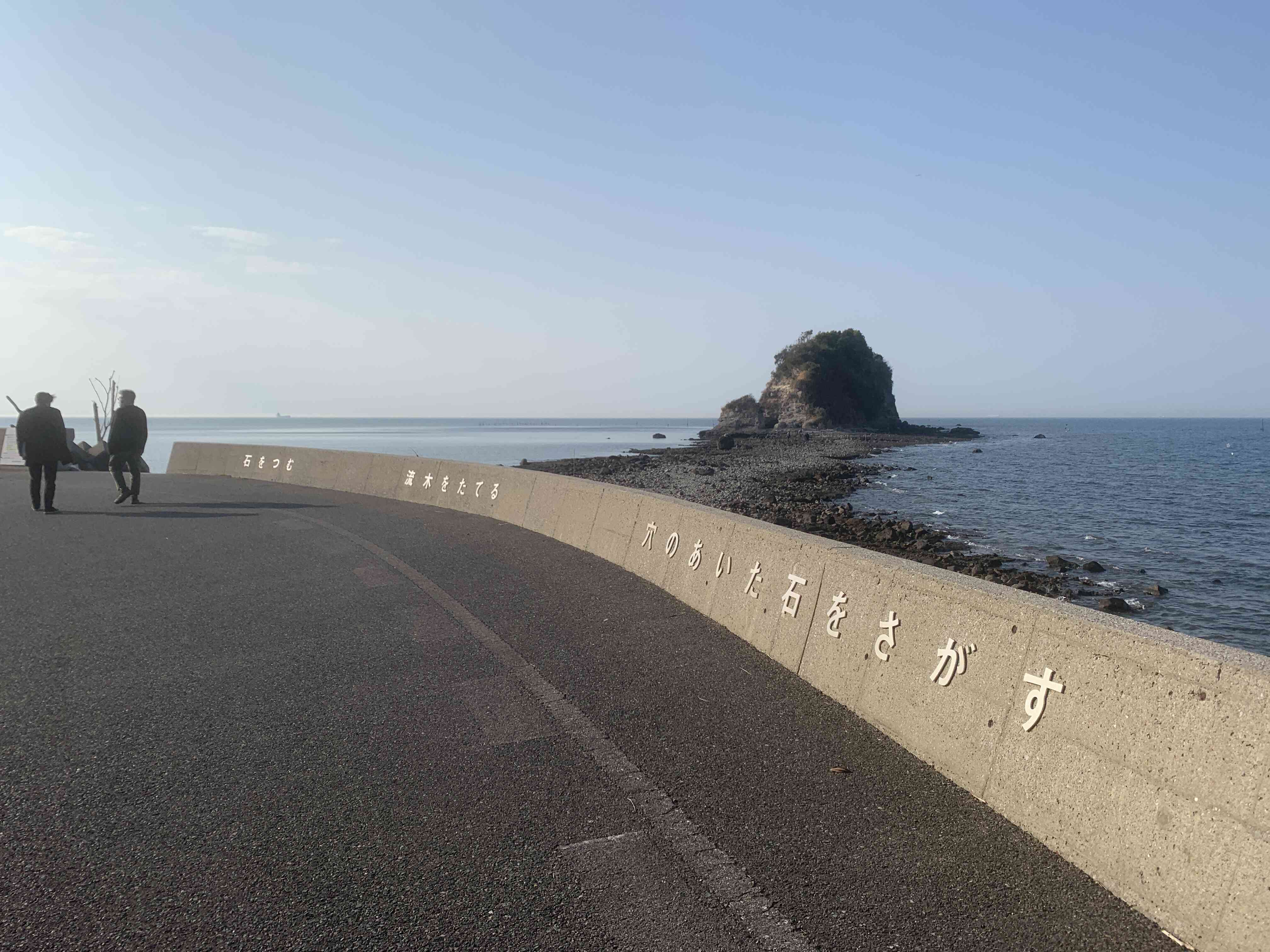 山間部を巡り、バスは北の海沿いに出る。Googleマップだと細長い小島がぽつんと浮かんでいるように見える馬ノ瀬は、干潮時には島と突堤が陸続きになり、歩いて渡ることのできる景勝地だ。