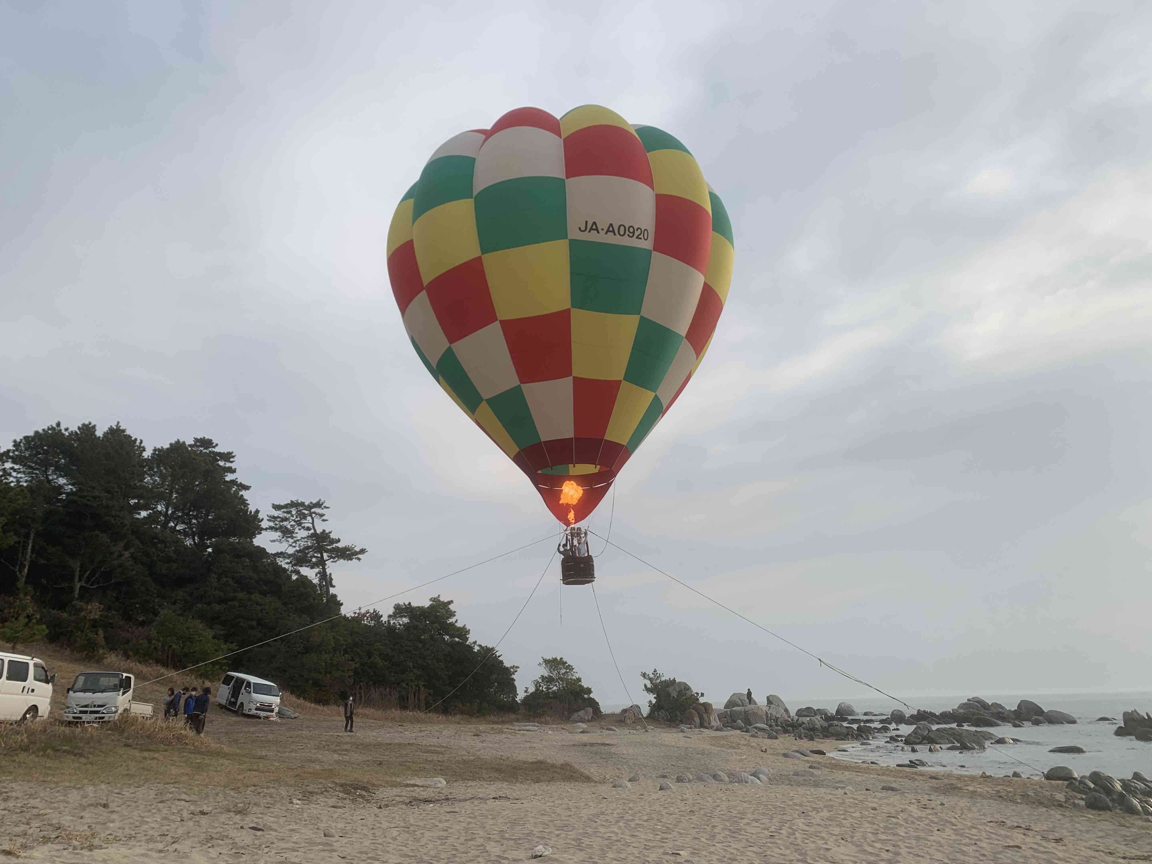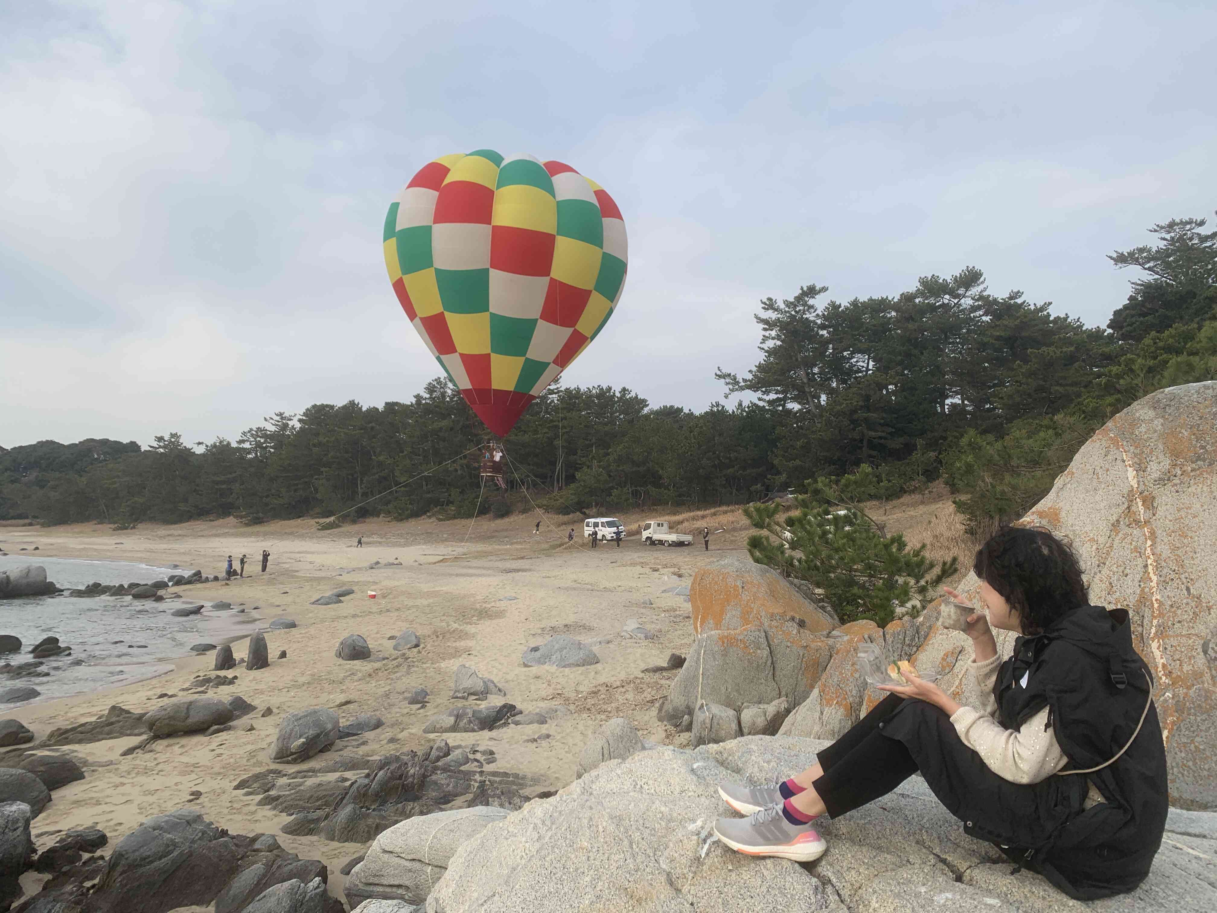 朝焼けに照らされた気球がゆっくり上がったり下がったりする姿は、果てしない自由を感じさせる。気球に乗ったレインボー衣装の人物(レインボー岡山)にうながされ、さらに奥へと進むと、そこにはエプロン姿の島袋とアシスタントの姿。即席のカフェスタンドでは、モーニングとしてコーヒーやたまごサンドやタコ飯が振る舞われる。なんと贅沢な朝だろうか。