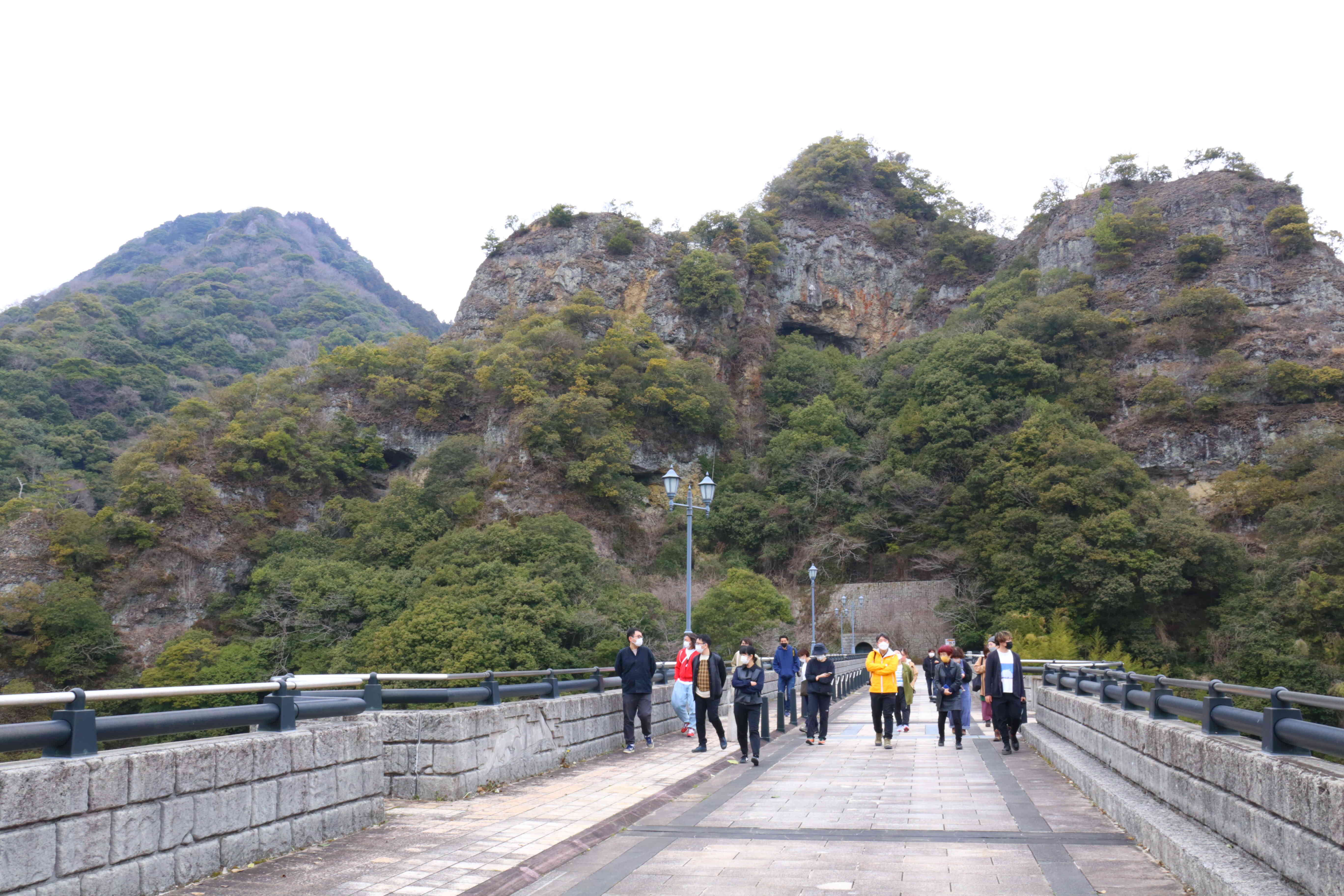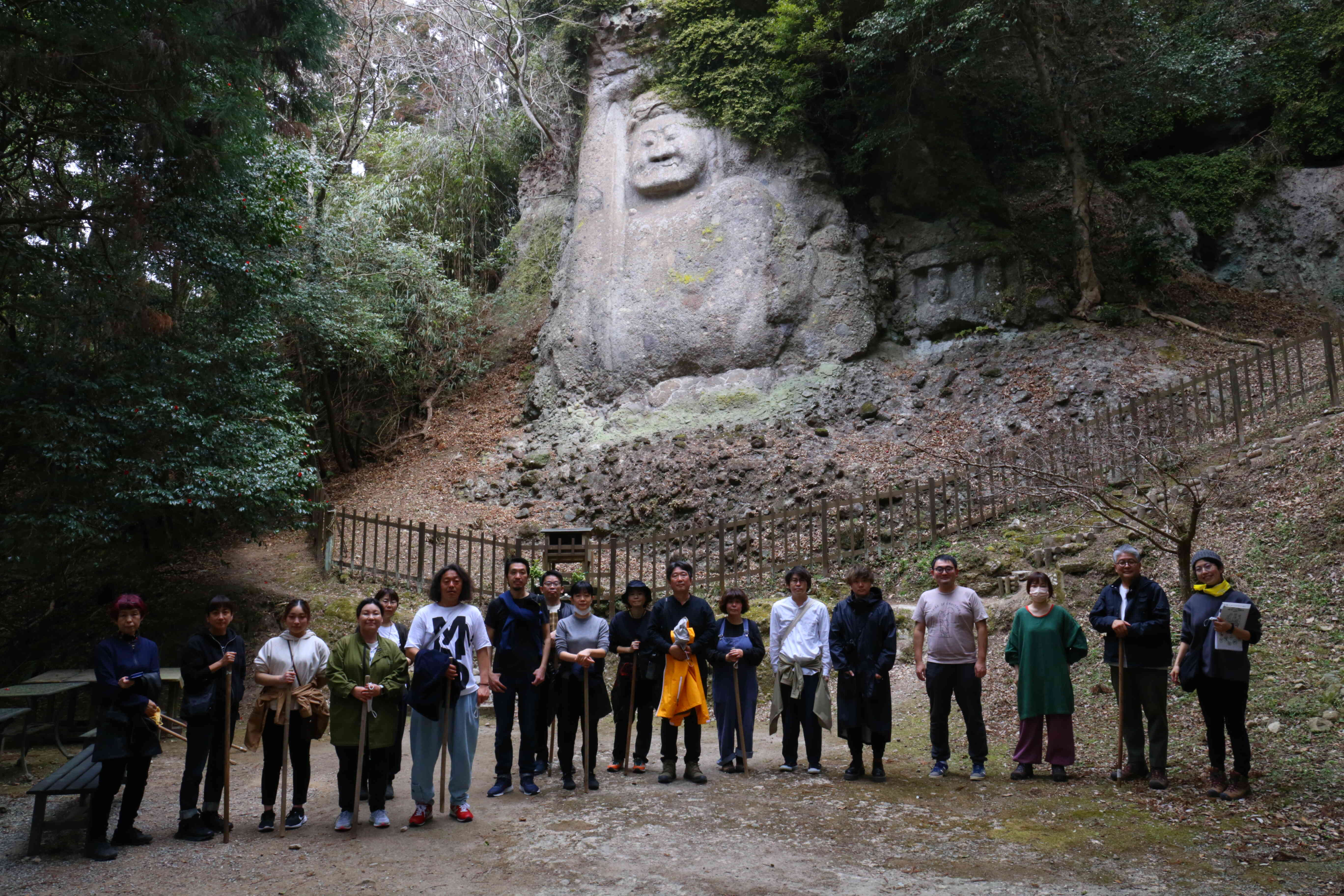 3月12日朝。大分県中部にある別府駅、大分空港を経由して10数名の参加者とツアースタッフ、そして島袋が集合した。大型バスが向かうのは、北東部に広がる国東半島。大分県全体で見れば、ヤンキーの横顔から突き出たリーゼントの部分、半島だけで見れば、火山である両子山(ふたごやま)を中心に据えたパラボナアンテナのかたちをしたこの土地は、いくつもの峰と谷がぐるりと円形に連なる、逆さに置かれたお椀のようでもある。