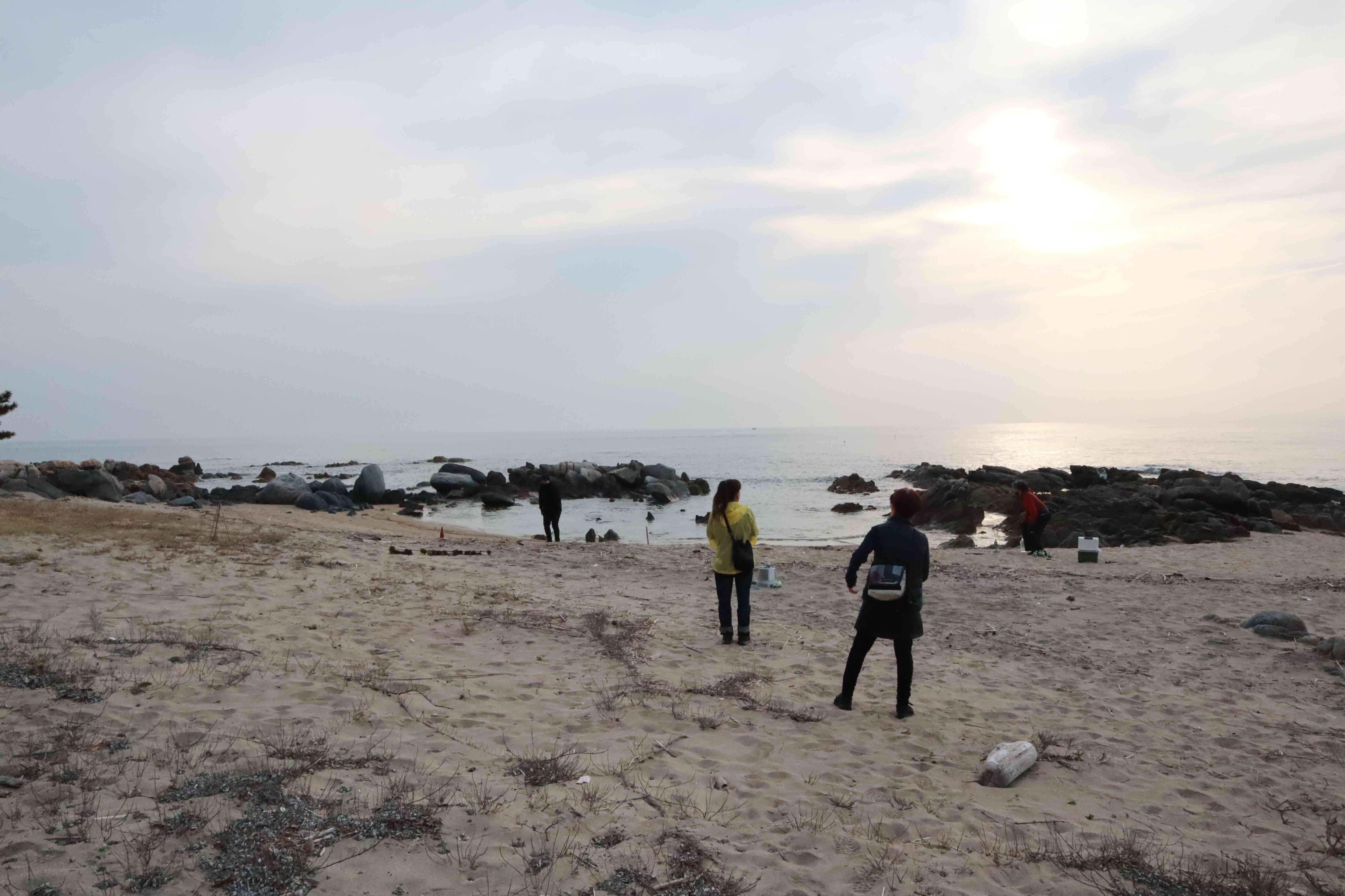 ホテルに泊まり、夜が明けて。2日目は、なんと早朝6時30分から最初の予定が組まれているあたり、島袋道浩の本気がうかがえる。前日に配布された手描きの地図を頼りに、参加者一人ひとりがホテル近くの砂浜へと向かう。2日間とも天候に恵まれた今回のツアーだが、朝の光はひときわ美しく心地よい。木立を抜けて、左にゆったりと蛇行する道を進むと、「パンッ」という破裂音が。昨夜に続き、梅田哲也によるパフォーマンスが海沿いで行われている。