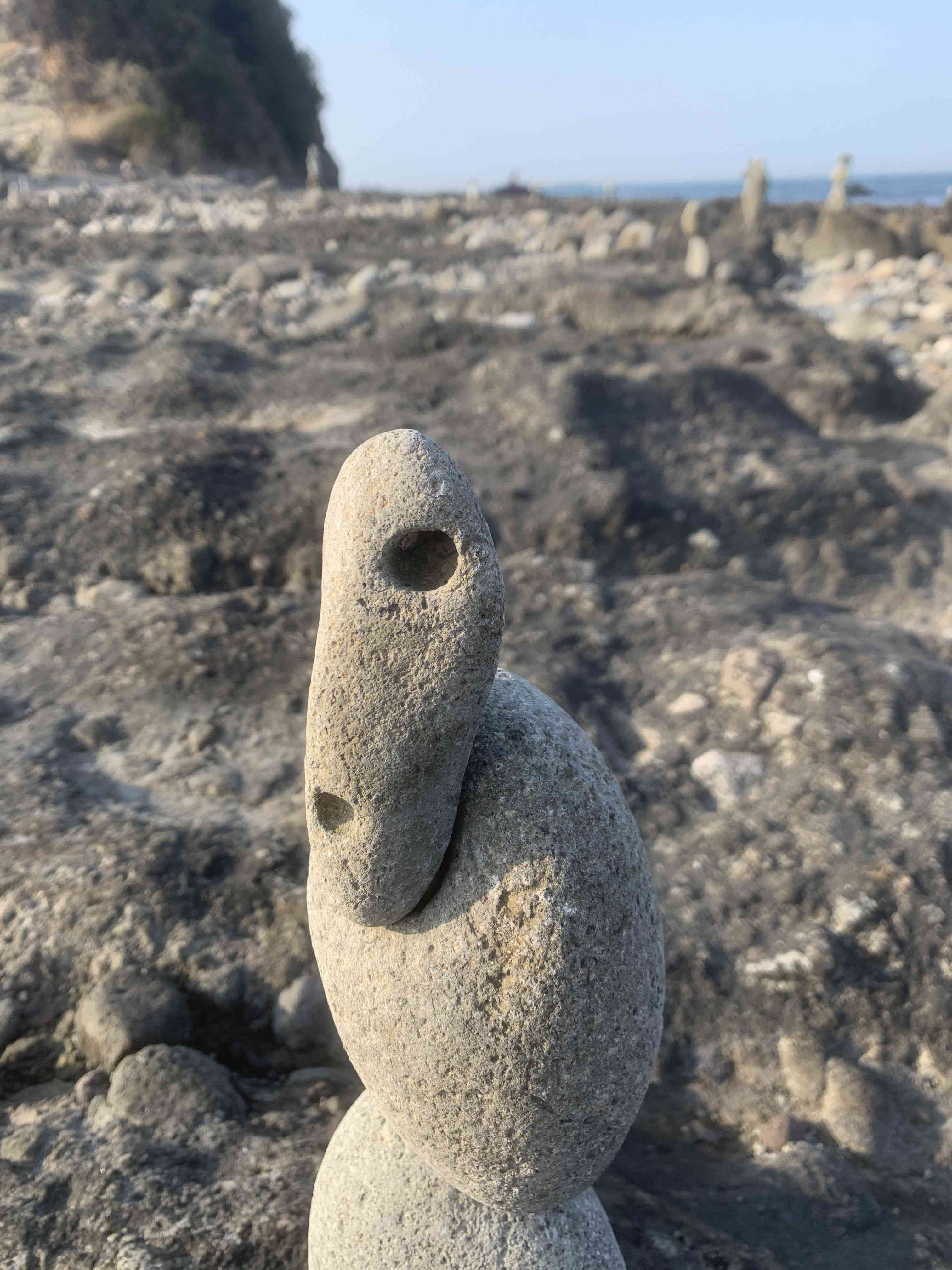 また「穴のあいた石をさがす」というインストラクションは、人々の視線を足元に向かわせ、無数の石の世界にある石一つひとつの個性に気づくきっかけをつくり出す。島袋によると、この海には石を食べる虫がいるらしく、なかには指輪のように見事な穴を穿たれた石もあった。