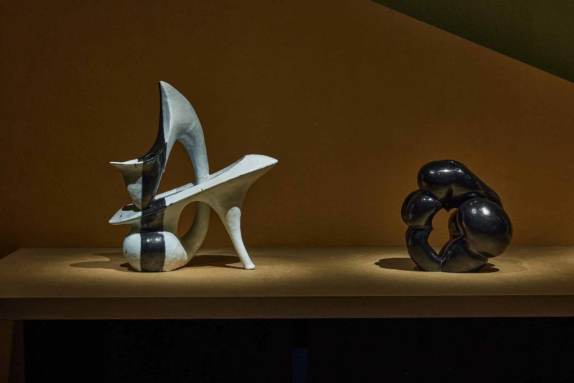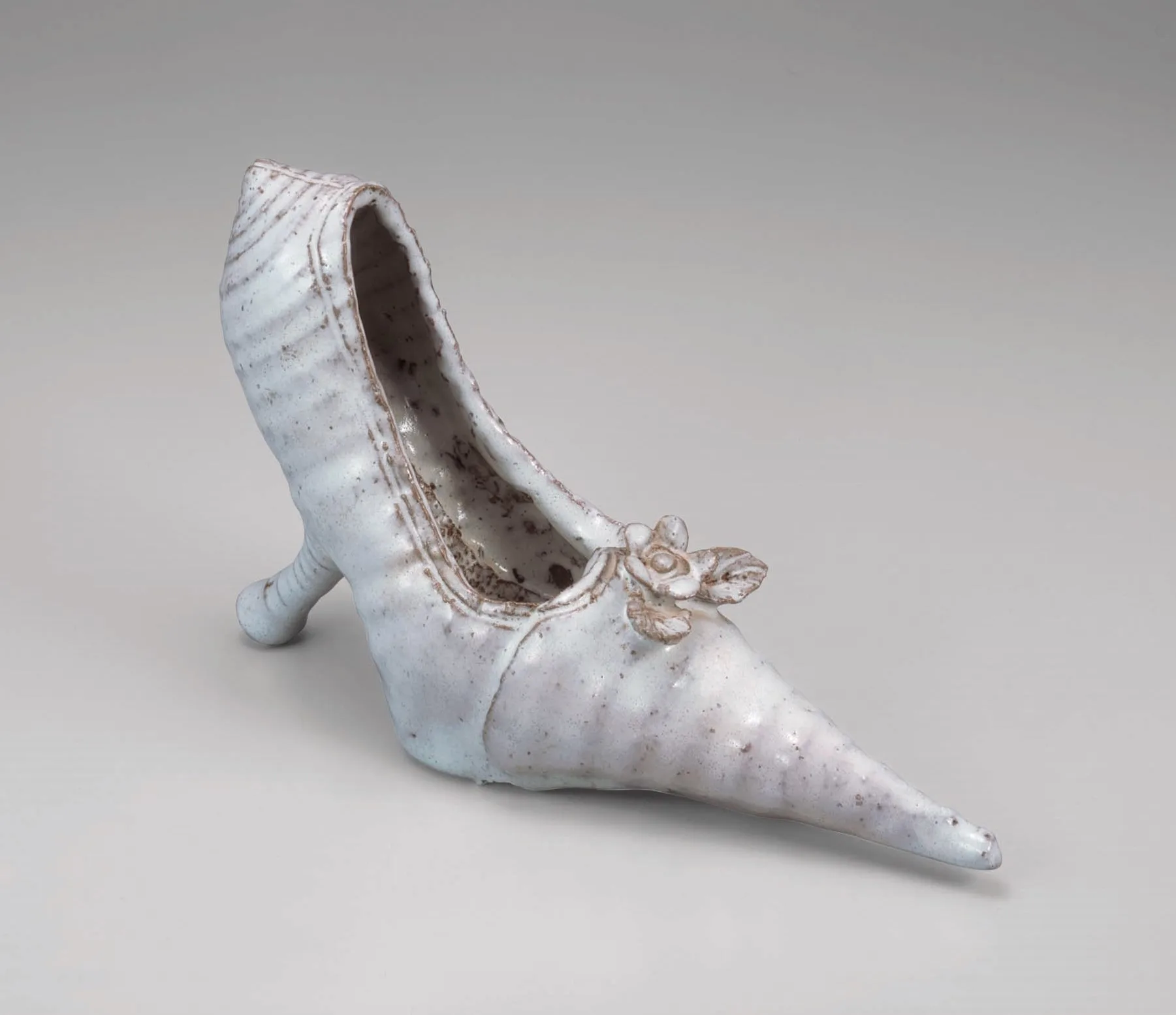 テーマやモチーフも多彩になり、里中英人《シリーズ:公害アレルギーⅠ―Ⅵ》のように社会問題を扱った作品も発表されました。現在も萩を拠点に活躍する三輪龍作(現・龍氣生/十二代休雪)の《愛の為に》は、ロクロ成形のハイヒール形態でフェティシズムや女性への憧れを感じさせます。