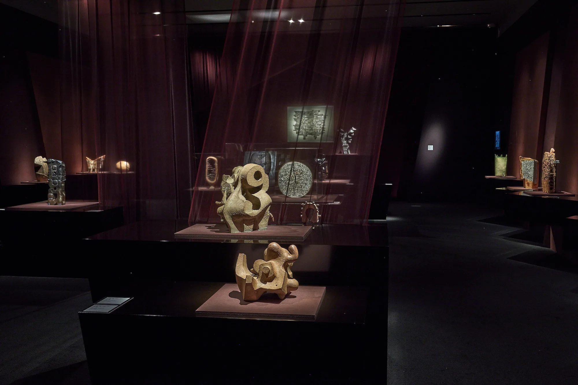 作品の配置に関しては、他館同様、章の構成にあわせて基本的に年代順に展示していますが、当館ではスペースの都合上、全3章構成の本展を2期に分け、前期では1・2章(走泥社結成から「オブジェ焼」の誕生とその展開)、後期では3章(「現代国際陶芸展」以降の走泥社)をご紹介します。本展は、走泥社の活動だけでなく、同時代に展開された他の前衛陶芸活動や日本の陶芸に影響を与えた海外の作品も併せてご紹介することが特徴のひとつです。それによって、前衛陶芸とは走泥社だけの制作ではなく、その時代のなかに生まれ、存在したものであることをご覧いただけると思います。そのためにも、当館では限られたスペースのなかで走泥社とそれ以外の作品との輪郭を明確にすることを意識した展示構成になっています。