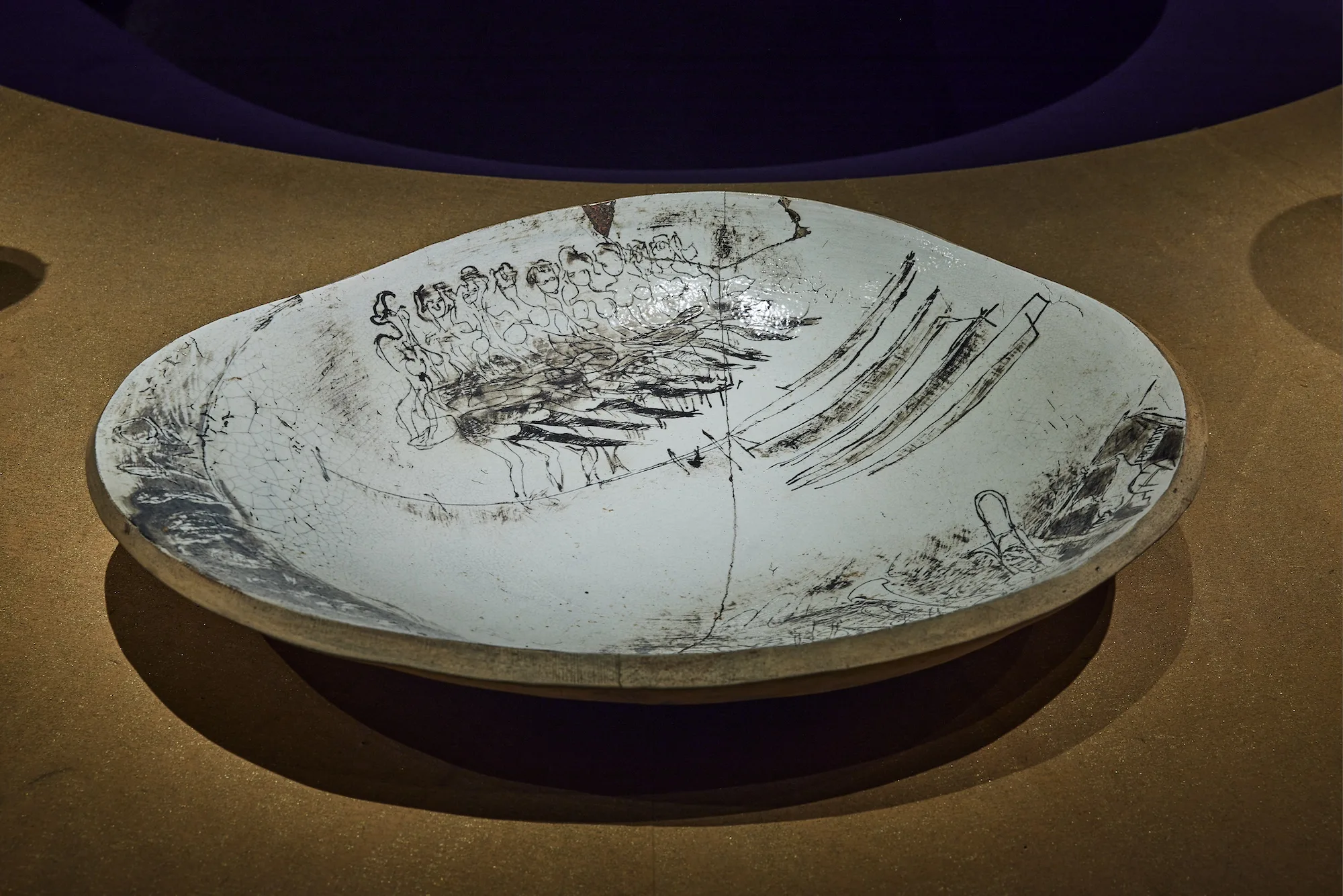 器形態を立体造形として成立させるための模索が初期の制作にあります。鈴木治の《ロンド》は、人間が踊る姿が抽象的に表現されて、器をキャンバスに見立てたようでもあります。八木一夫の《白釉レビュー図蛤形水盤》は、女性が歌い踊るレビューの場面を見込みに描き、日本の陶芸の中にある文様ではない絵画的な表現が為されています。