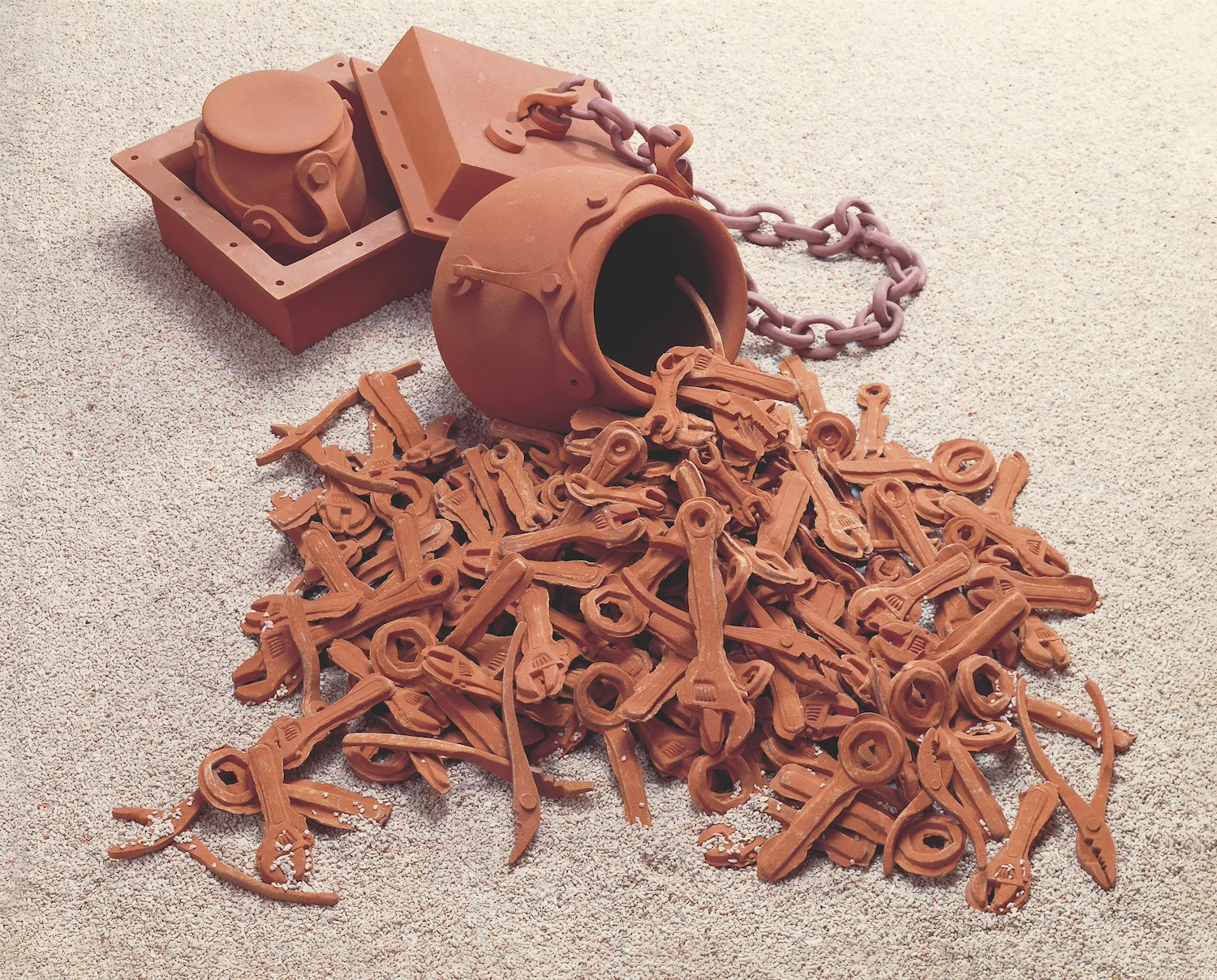 たとえば、壺形態から無数のスパナがあふれ出た高野基夫《ノンセンシカル・ムード》があり、また、林康夫《ホットケーキ》ではナイフを当てた際の弾力を感じさせるような膨らみのある形が陶で表現されています。
