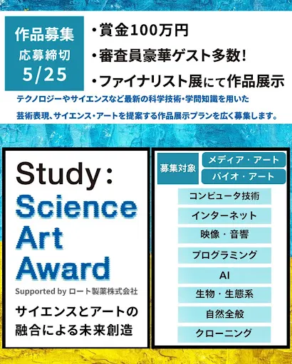 関連プログラムとして、「科学技術と芸術表現」の融合をテーマに、AI、バイオテクノロジー、映像、音響、プログラミング、生態系などの先端分野を活用したメディアアート、バイオアートを募る公募アワード「Study:サイエンス・アートアワード Supported by ロート製薬株式会社」では、ファイナリスト5組がアートフェア会場にて新作プランを展示。最終審査によってグランプリや各賞が授与される。