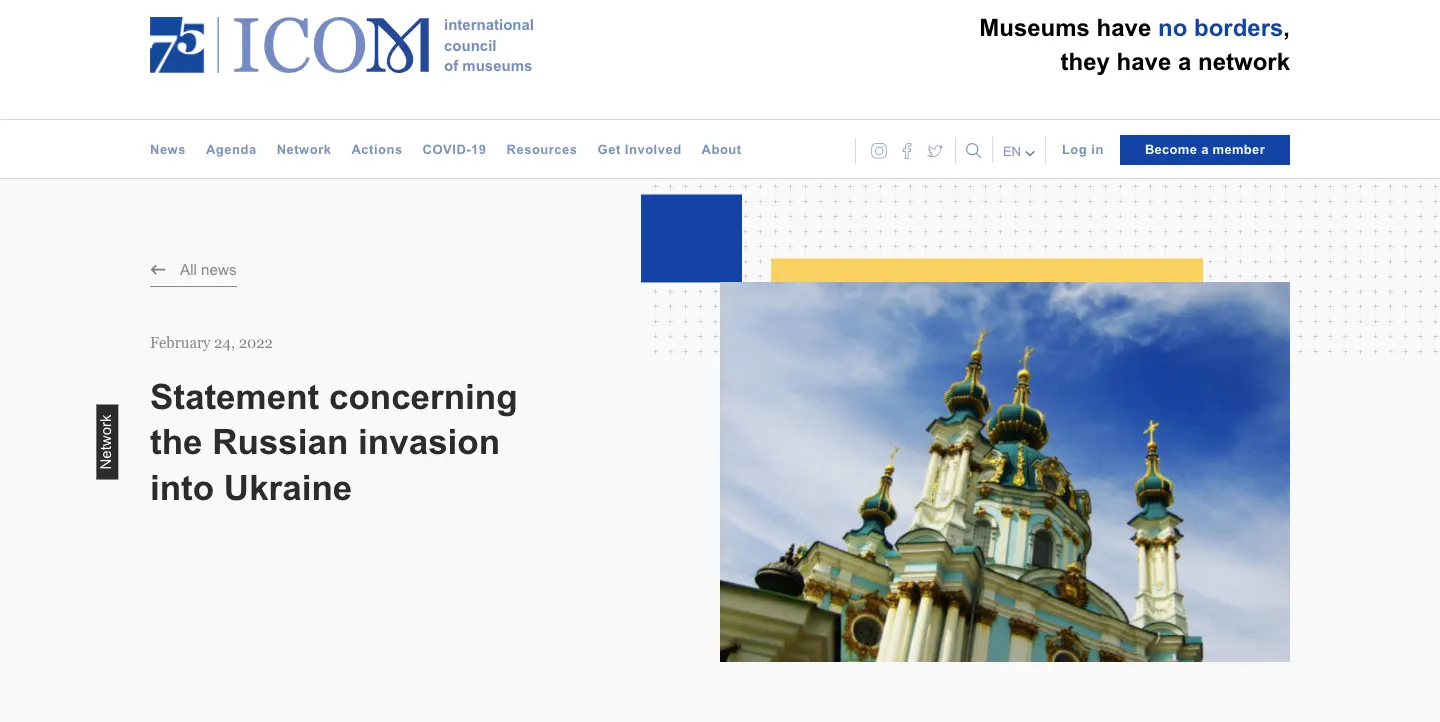 ICOM(国際博物館協議会)は、ロシアによる侵攻が始まったまさに2月24日、ホームページ上で「ロシアによるウクライナへの侵攻に関する声明」を掲載。ロシア連邦軍によるウクライナの領土および主権侵害を非難するとともに、「武力紛争の際の文化財の保護に関する条約」(1954年ハーグ条約)に基づいて、遺産保護のための国際的な法的義務を順守するよう訴えた。現在、ICOM日本委員会ホームページでは、日本語訳された声明閲覧できる。