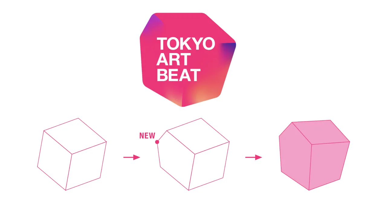 Tokyo Art Beatのトレードマークであるピンクの四角いロゴも、2004年の創設以来初のリニューアル。四角を立方体としてとらえ、一辺に点をひとつ足すことで七角形になりました。このかたちや色のグラデーションには、アートに対する人の多様な思考・解釈の意味が込められ、Tokyo Art Beatが新たなステージに向け広がっていくことも表しています。