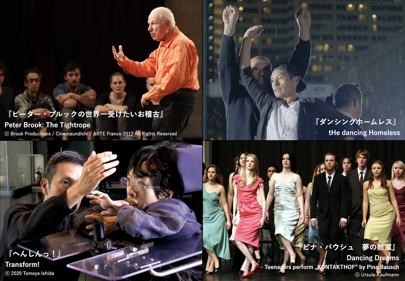 作品は、今年の7月に亡くなった演劇界の巨匠、ピーター・ブルックのワークショップに2週間密着した『ピーター・ブルックの世界一受けたいお稽古』、路上生活者、元路上生活者がメンバーのダンスカンパニー「新人Hソケリッサ!」(アオキ裕キ主宰)を追った『ダンシングホームレス』、車椅子に乗った監督が、異なるバックグラウンドをもつ他者との表現活動の可能性を探った『へんしんっ!』、65歳以上のシニアが踊る舞台『コンタクトホーフ』をダンス未経験のティーンエイジャーでつくり直す過程を捉えた『ピナ・バウシュ 夢の教室』。料金は4作品セット視聴券500円(税込)。