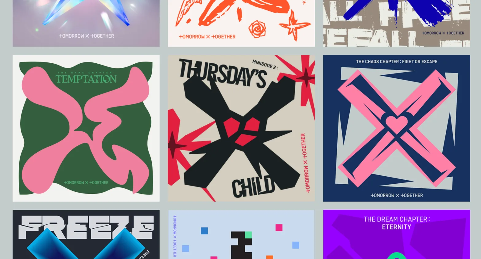 デビュー作『The Dream Chapter: STAR』(2019)のロゴアニメーションでは、色だけが異なる2つの幾何学的な記号が出会って重なり合い「X」の文字を作る。TXTのブランディングを手がけるBX2部門のチェ・セヨルは、これは「自分と同年代の集団、つまり『僕たち』の関係のなかで、自らのアイデンティティを見つけようとする物語」を反映したと説明している(*1)。