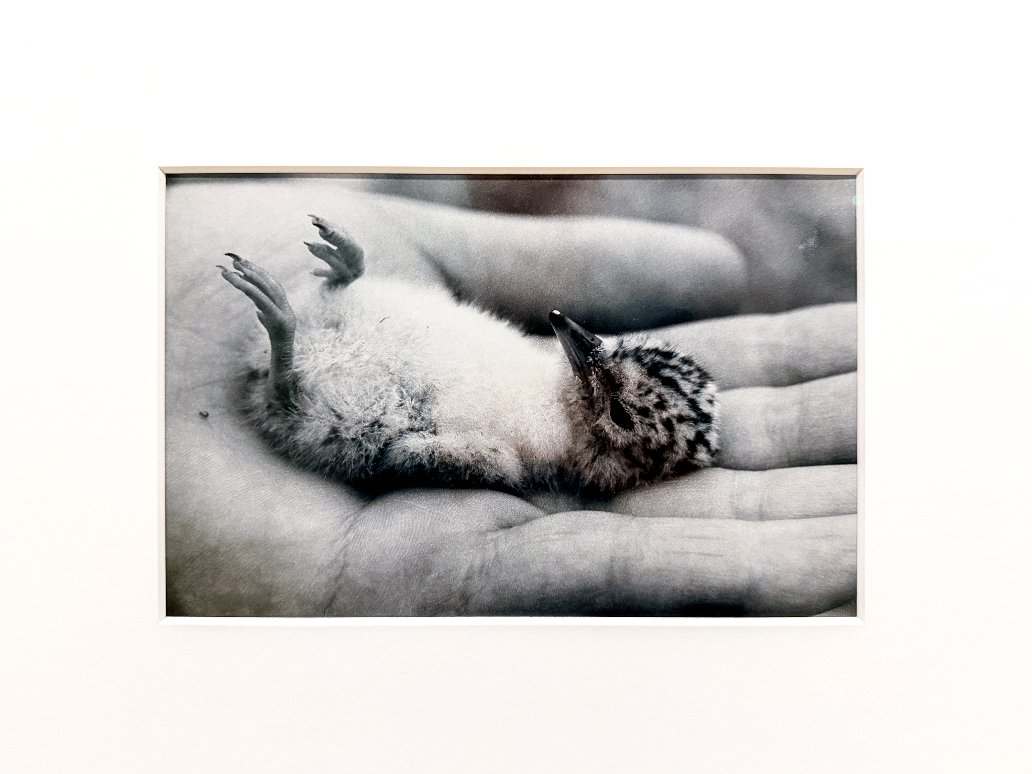 マン・レイ、エドワード・ウェストン、恩地孝四郎によるオブジェや静物・自然物をモチーフとした作品は、造形的な美しさとともに触覚を強く刺激する。いっぽうで、近藤龍夫の「湖北」や北井一夫の「村へ」シリーズといった戦後日本の名作・知られざる逸品にも、視覚的要素を超えた触感や温度、想像上の音や匂い、湿り気までもが宿っている。なかでもコアジサシのヒナをとらえた田村栄の《多摩川の鳥》(1961)が本展のメインヴィジュアルにも採用されている。危険を察知すると石のように固まるというヒナの姿は、「物に触れて感じる力」という本展のテーマを体現するかのようだ。
