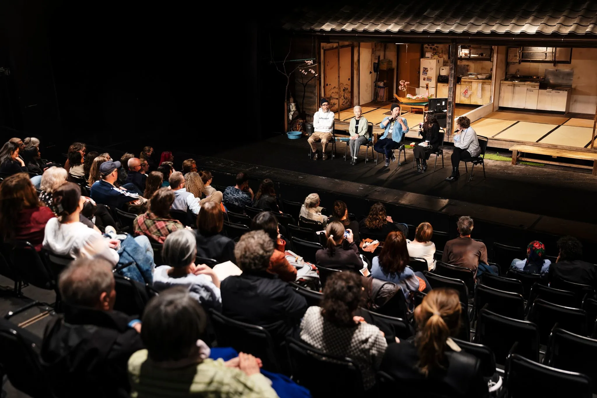 舞台上にはその7名が広がって着席していて、舞台後方下手側にタイトルにあるリビングルームらしい空間がある(美術はdot architectsが担当)。俳優はまず、そこで演技を開始。時間が経過するにつれ、リビングルームの枠組は次第に解体されていき、俳優は一人ひとり前面の舞台に浮遊するかのように漂ってくる。