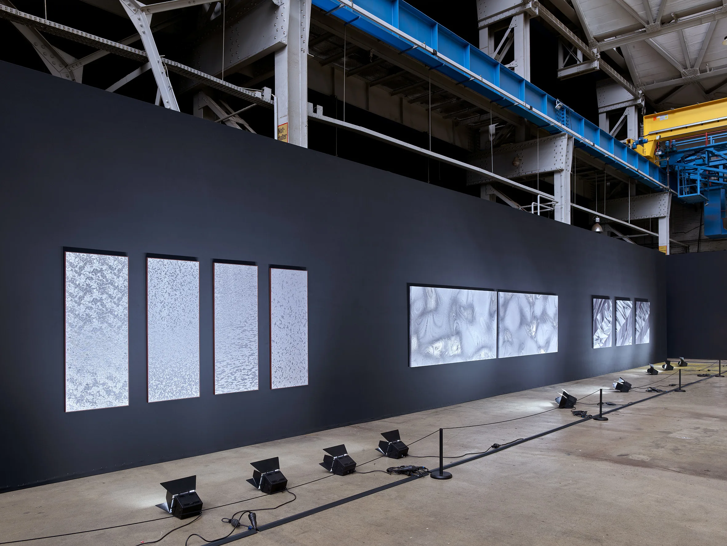 展示は「メディアアート―ヴィジュアルアート、イマーシヴ・アート、ロボティック・アート、アルゴリズム生成アート」と「VRとAR」の二部構成。巨大な装置から落下する水を制御しつつ、流れる水流が低解像度3Dディスプレイともなる高谷の《ST\LL for the 3D Water Matrix》(2014)(*1)や、様々なビッグデータの生データ(RAWデータ)を視覚言語に「再分節化し、美学的・聴覚的崇高を魔法のよう呼びだす」(展覧会カタログ、P199)池田の《data-verse 1》(2019)や、彼らが関わったダムタイプの上演作品から立ちあげられた《MEMORANDUM OR VOYAGE》(2014)。あるいは、リアルな環境のみを素材としてVR映像世界へ変換するベルリン在住の黒川良一によるVRを用いたインスタレーション《in s.asmbli》(2020)や京都・西陣織の老舗「細尾」とのコラボレーションによる伝統織物とコンピュテーションを出合わせる堂園翔矢+細尾の《Subspieces (Petals)》(2020)と古舘健+細尾の《Shusu / Moiré & Aya / Lines》(2022)も出品されている。