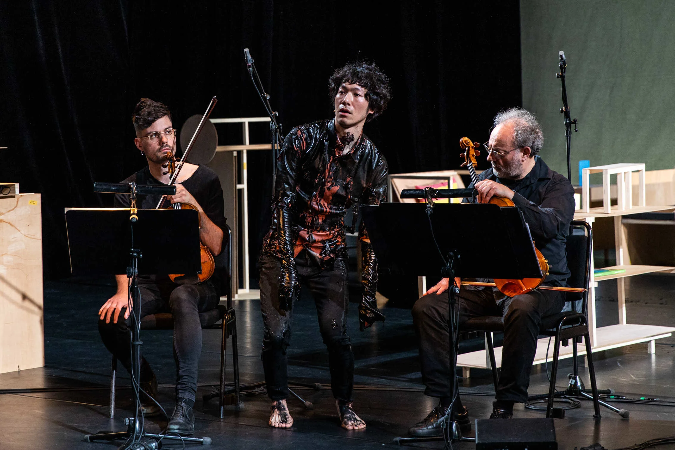 岡田と音楽家のコラボレーションはこれが初めてではないが、今回は現代音楽の作曲家でロンドン在住の藤倉大がクリエーションに参加し、「音楽劇」として上演された。音楽は7名編制のクラングフォルム・ウィーンによるライブ演奏。