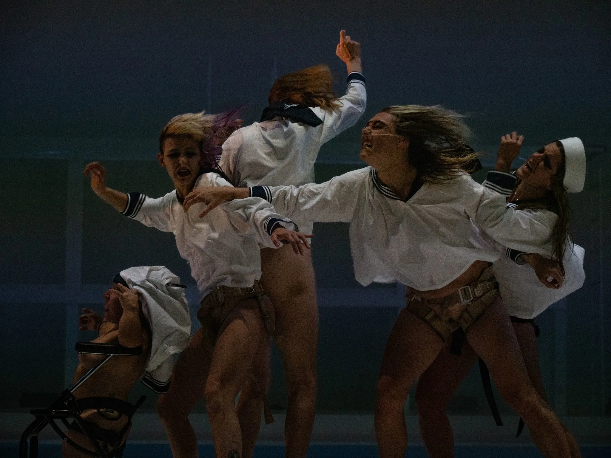 他方の『オフィーリア〜』は、シェイクスピアの『ハムレット』に登場し、ミレーの絵画で西洋芸術史に「受動的存在」として視覚的にも定着した感があるオフィーリアに才能があるというシンプルなタイトル。だが、ヘリコプターやら巨大水槽が出てくる一大スペクタクルである。タレントショーの楽しげな装いで開始されるものの、ボディー・サスペンションや無呼吸潜水といった離れ業や「水兵ダンス」なるタップダンスのシーン。そして、舞台に水が湧き出てプールになったかと思うと、巨大なヘリコプターが空から舞い降りもする。