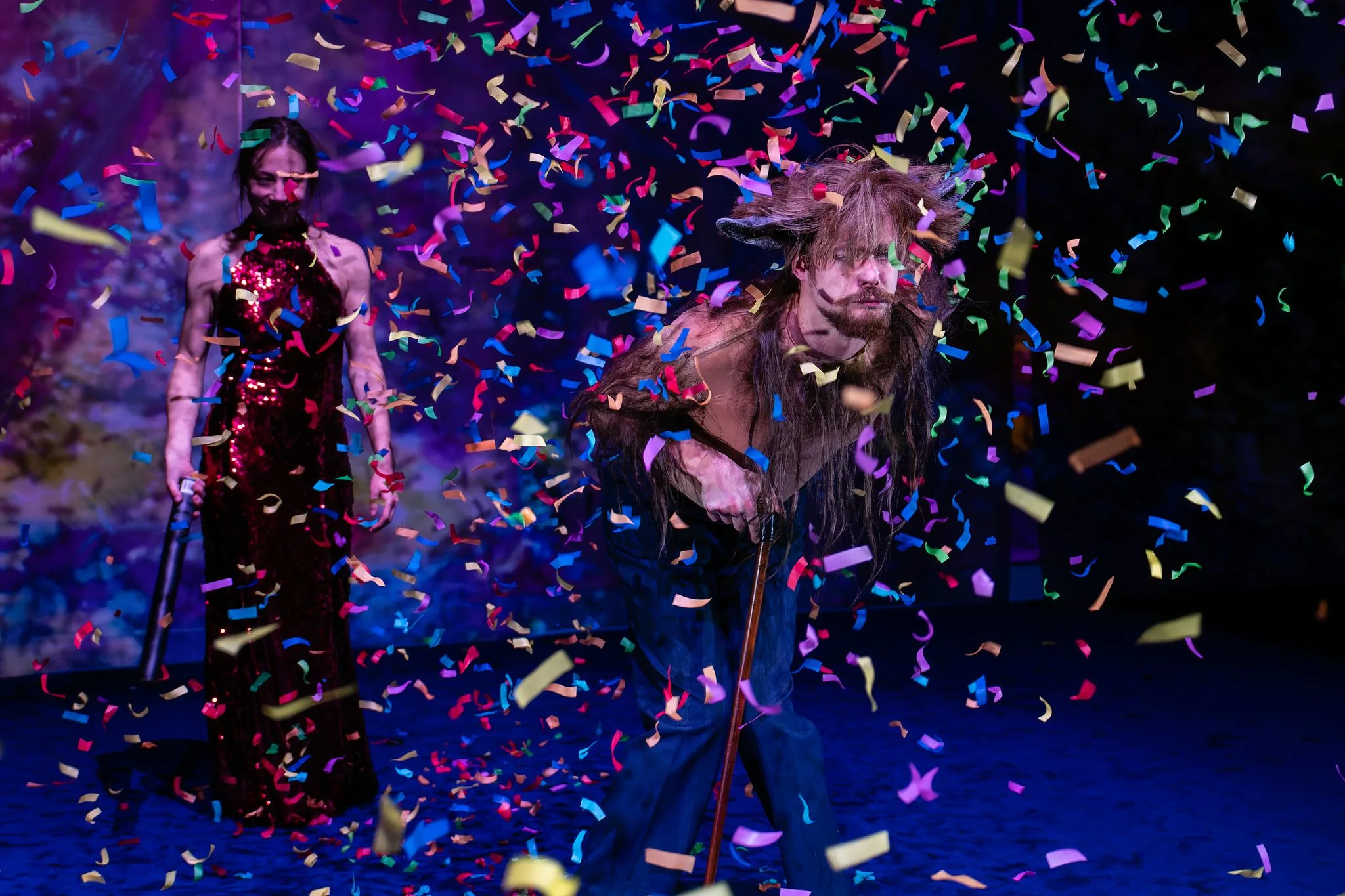 他方の『オフィーリア〜』は、全裸であることが多いパフォーマーたちの過激なショーとダンス、間に挟まれるプライベートな語りの交錯から出現する自己肯定性とスペクタクル芸能史への批評性といったジャンル乗っ取り感と、それを凌駕する高揚感がなによりの特徴である。