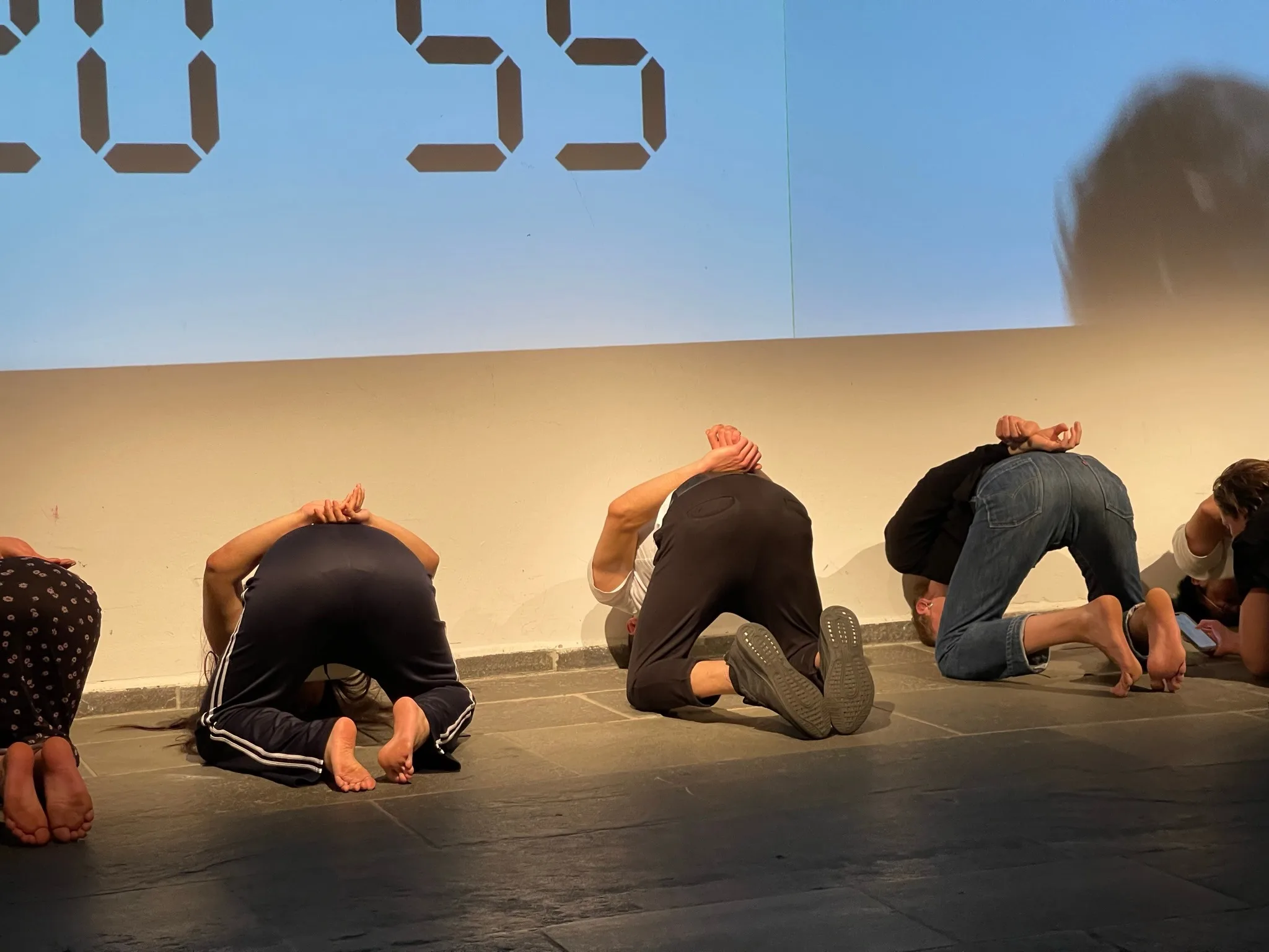 即座にひとりのアジア人が加わった。どこから来ましたか、と聞かれて「香港」と答える。その後、少しずつ参加者が増えていき、最後は6名ほどが、身体に負荷がかかる姿勢を続けた。わたしは参加する「資格」があるかどうかなどという自己問答を続けるうちに、時間表示は「00:00」となって終了。しかしそのときには、屈辱的な姿勢が参加者間の連帯感に反転し、わたしはといえば、ひりひり感をともないつつも、その一角に加われたような気がしたのだった。