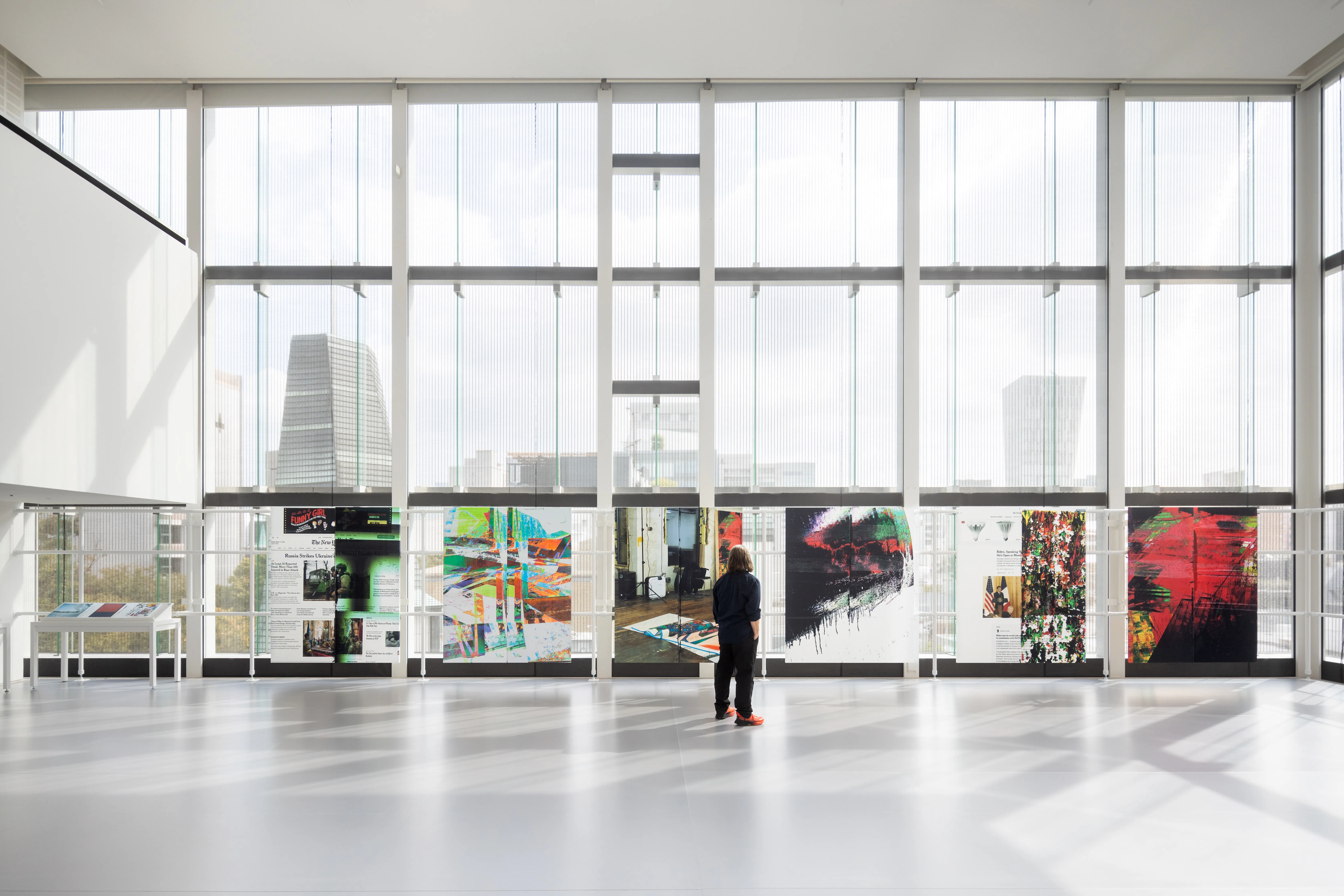 このスペースで展覧会が決まったとき、まず壁の透明性に非常に興味を惹かれました。外からの景色が作品と対話できるのではないかと考えたんです。ニューヨークのスタジオの窓を写している作品もあるので、様々なイメージが重なり合い、独特な重層感が生まれます。