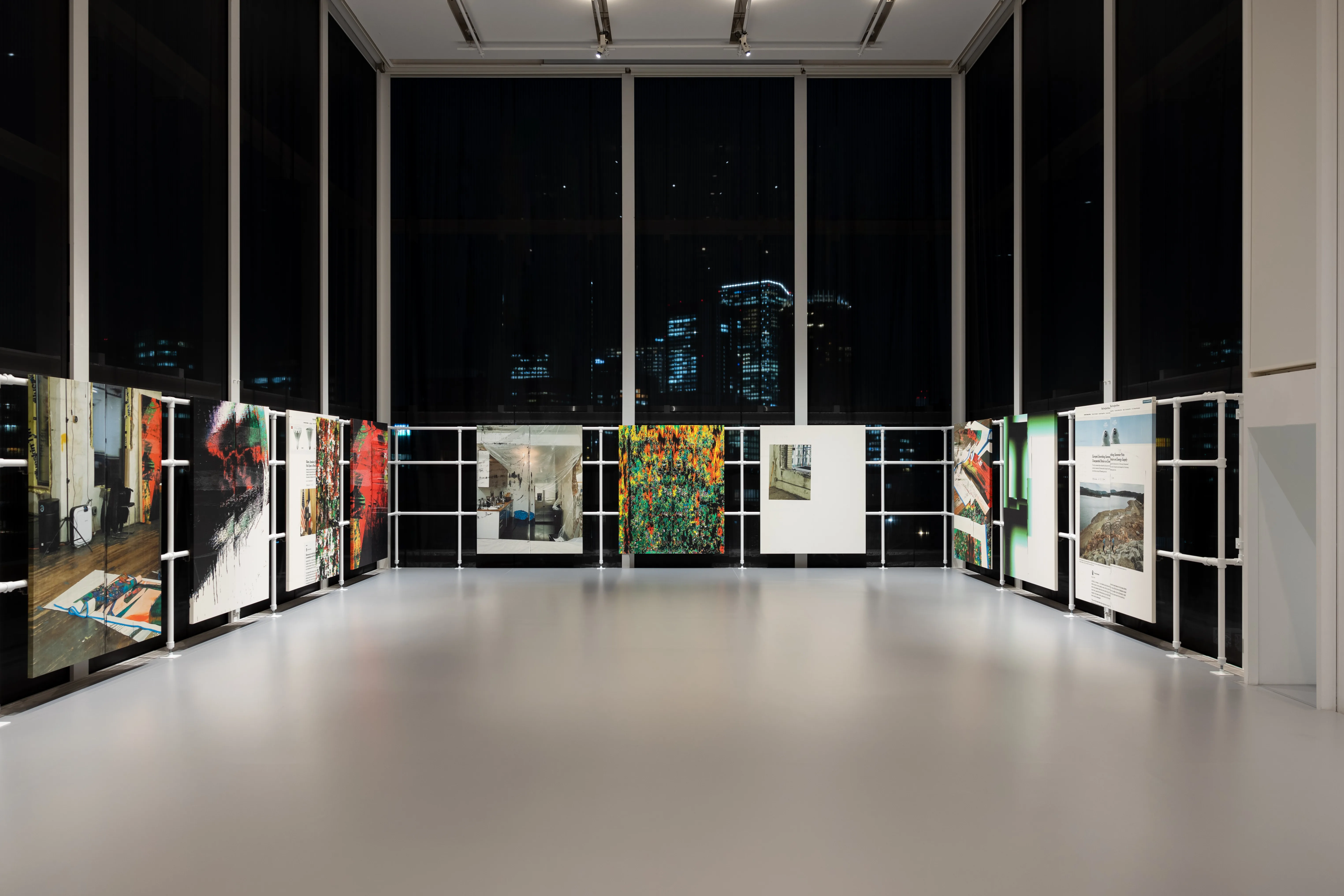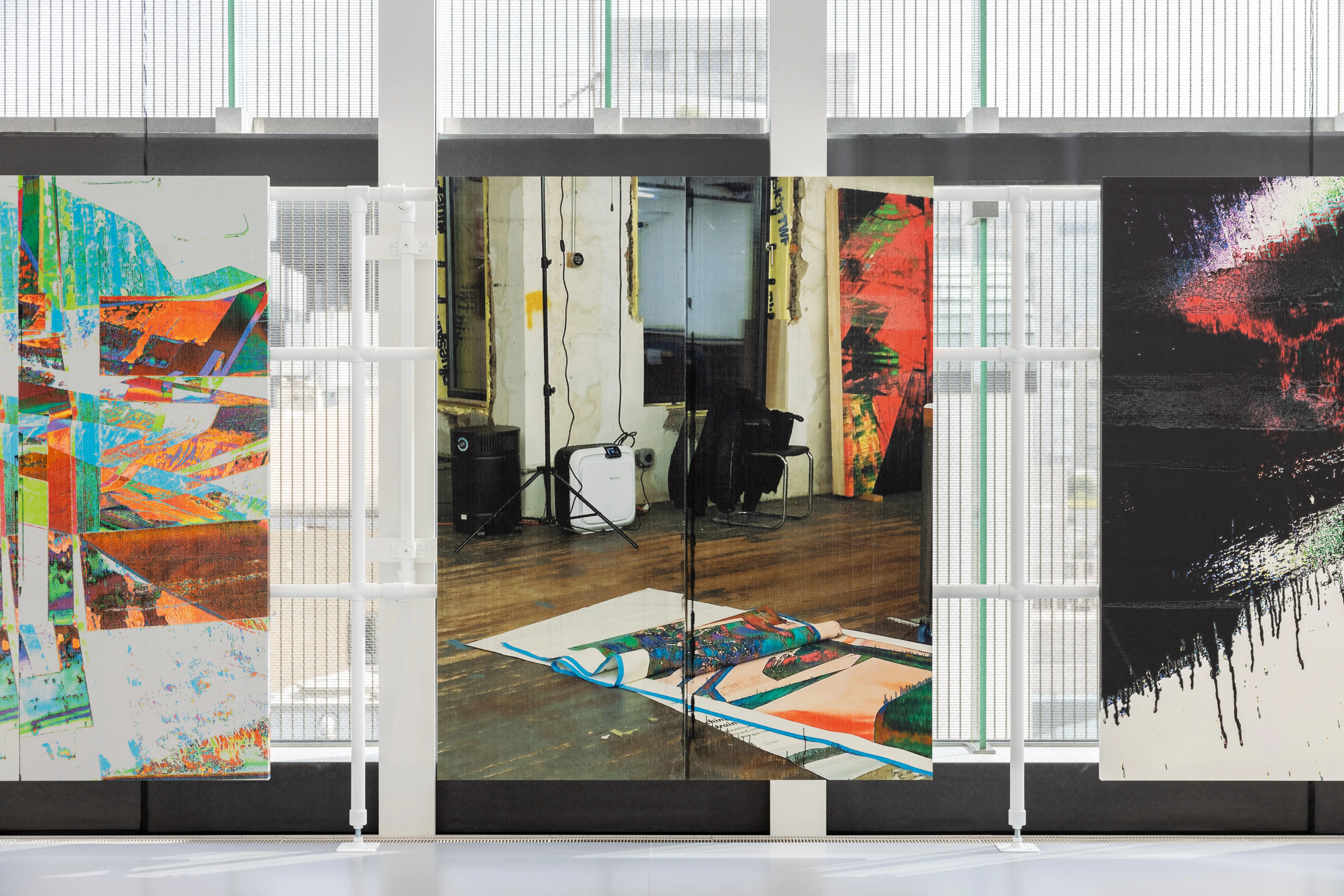 ——展示空間とパイプ構造は、この場所自体が作品を制作している最中であることを示唆し、ある種の仮設性を呼び起こします。たとえば、床に立て掛けられた1枚の絵画は別の作品とも交換可能のように見えます。この一連のイメージと展示方法に通底するテーマはありますか。