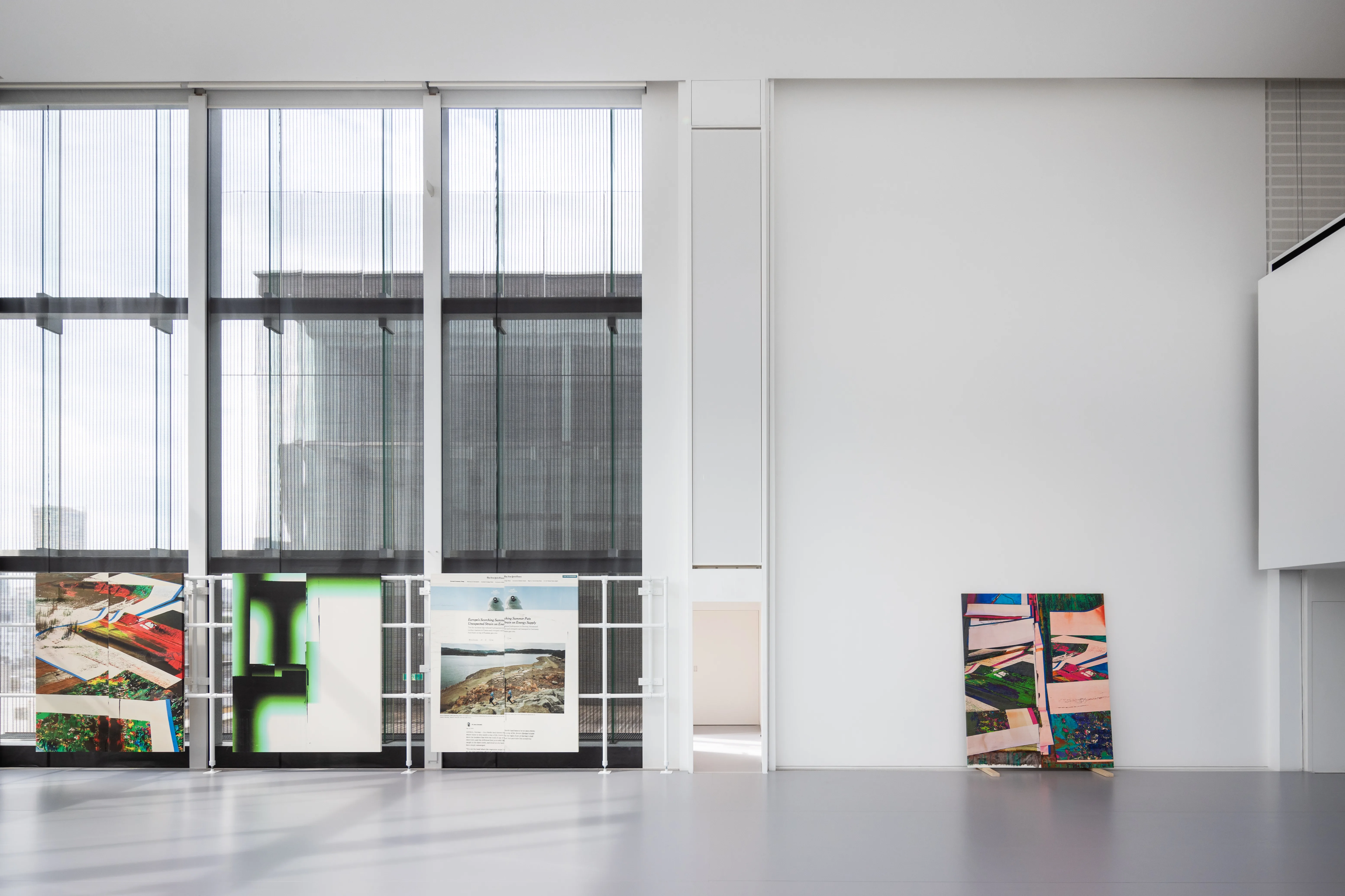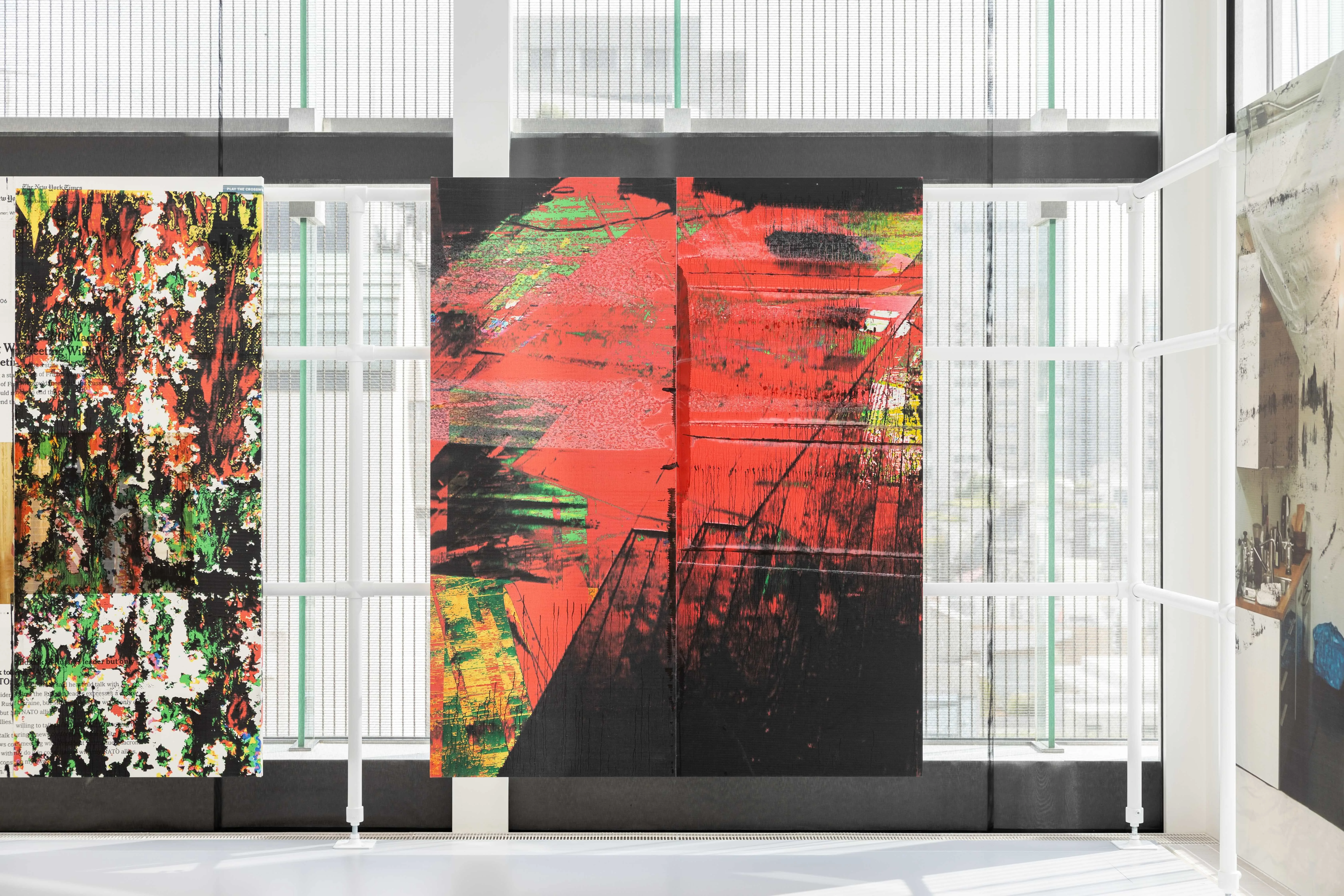いくつかの作品は、制作過程やスタジオで時々読んだニュース記事を写しています。コラージュやモダンアートに新聞が使われてきた歴史は長いですが、ここで記録されているのはウェブサイトの一面です。ウェブ上で広告や見出しは絶えず変わり続け、様々な情報の入り口となっていますが、絵画はこの絶え間ない変化を固定化してくれるのです。また、作品自体が制作のアーカイヴとして機能することもあります。絵画をパイプ構造と組み合わせることで、開放性、可変性、あるいは不安定さが生まれると思います。