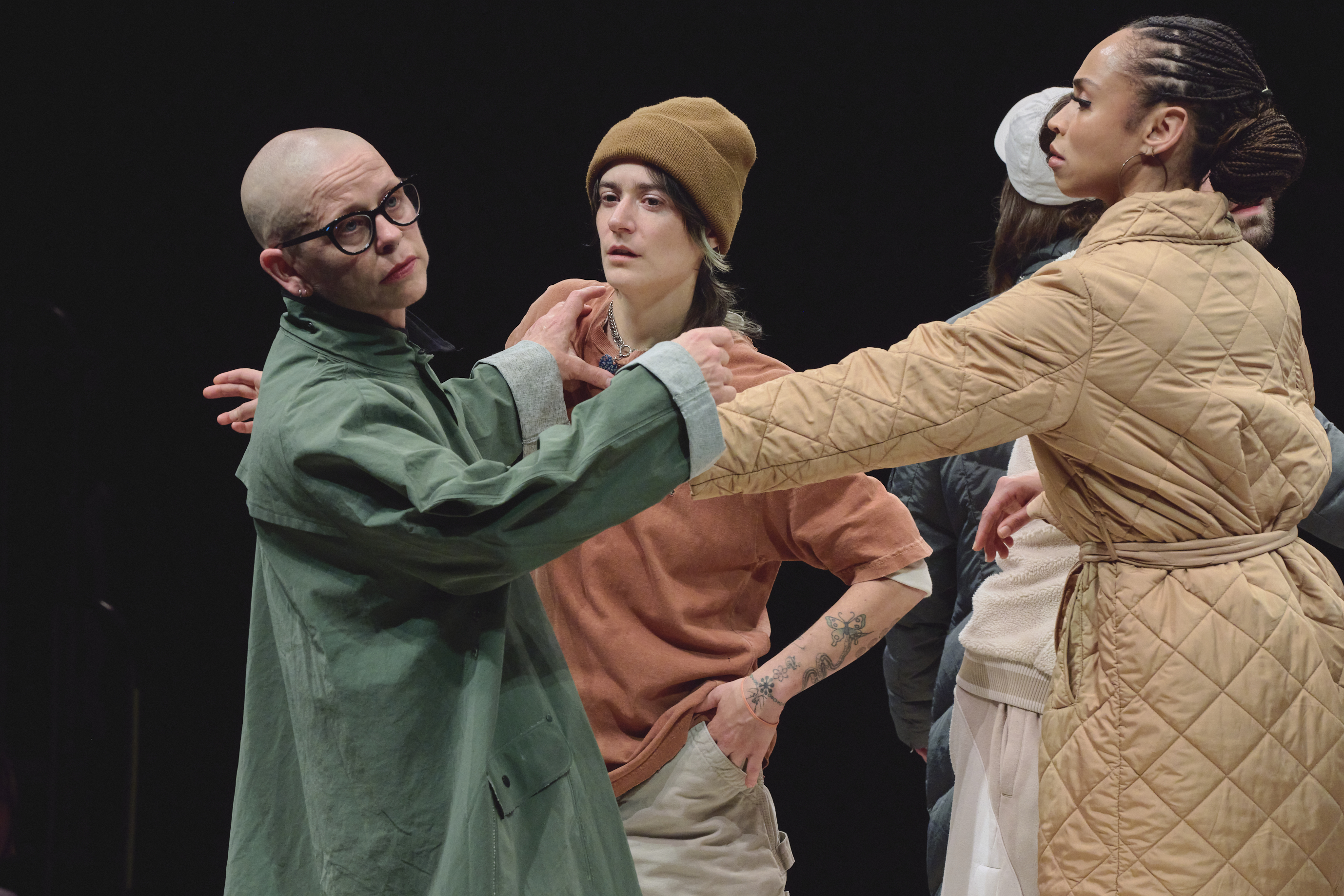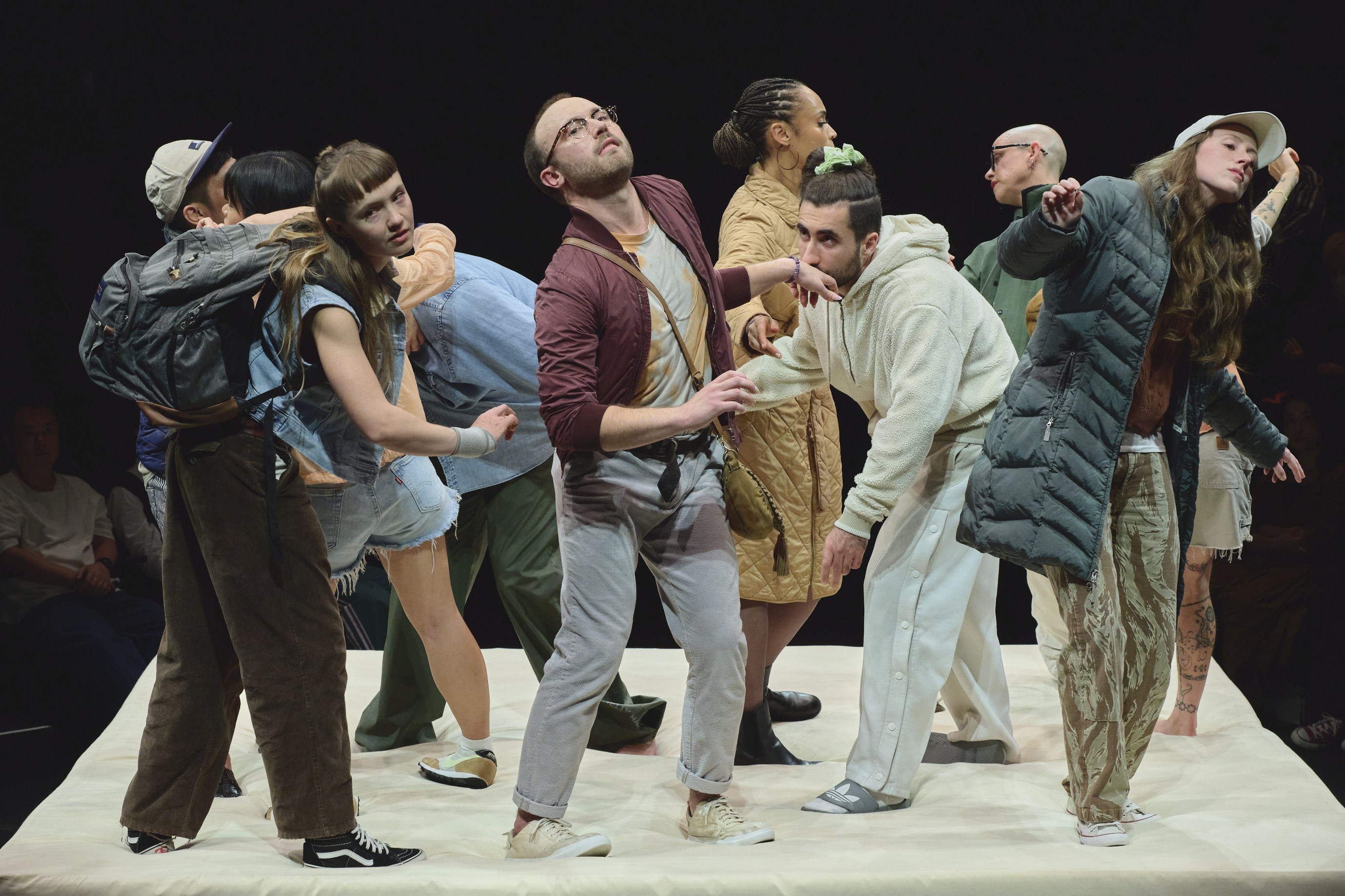 Skin......Teeth......Tongue......Vein......Blood.......不穏なコーラスとともに入場した10人によって、活人画のようなパフォーマンスが幕を開ける。舞台となる中央の白い大きなマットレスは、目算で3m×3m、高さは50cmほど。四方をロの字型の客席に囲まれている。「活人画のような」とはいったものの、その柔らかい足場は明らかに、ポーズをとって静止するのには向いていない。初秋のニューヨークを歩いていそうな老若男女が、不安定なベッドのうえに脚を震わせて立ち並ぶ。観客に悟られないようさりげなく動き、ちょっとよそ見をした隙に次々とポーズを変え、いつのまにかそこかしこでコンタクトを始めている。禁欲的で端正な絵作りには、ゲーム的な緊張感が漂う。企みに満ちた目線の動き、無理な姿勢を保持する筋肉の収縮と息遣いは、どこか「だるまさんが転んだ」を思わせる。