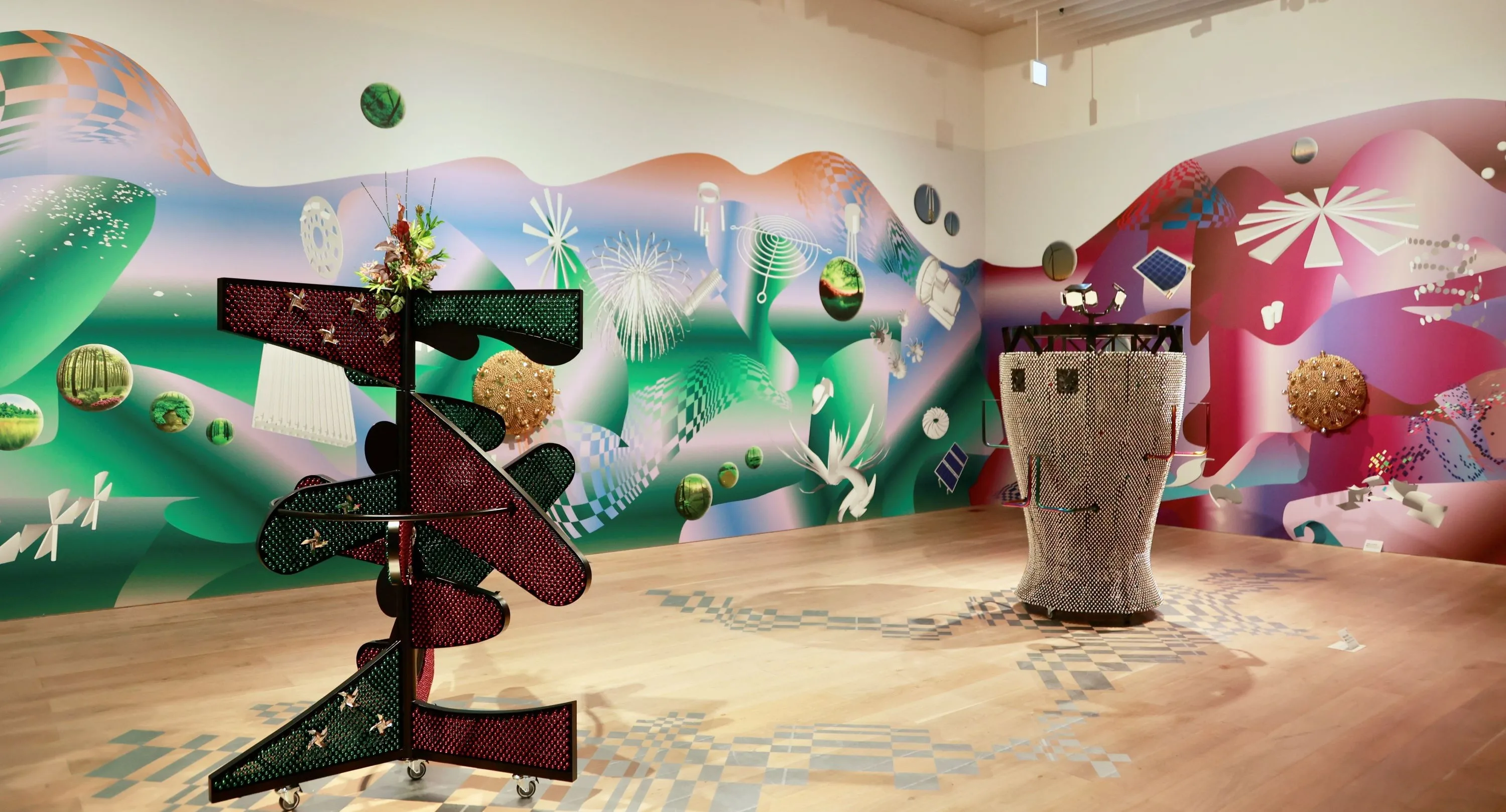 最後の「総合」のセクションは、様々な参照点を持ち、領域横断的な制作が際立つ作家に焦点を当てた。韓国のヤン・ヘギュは一室を丸ごと使い、エネルギーの循環を意識した新作群を展示。日系ブラジル人作家の大竹富江の彫刻と原子力発電冷却塔の形を引用した立体作品、気象記号や自然現象のイメージで構成した壁紙など、多様な学びが織り込まれているとわかる。