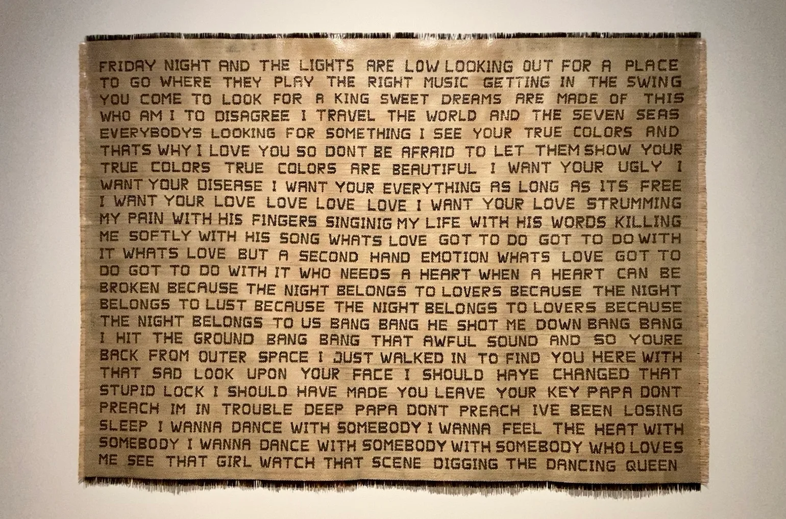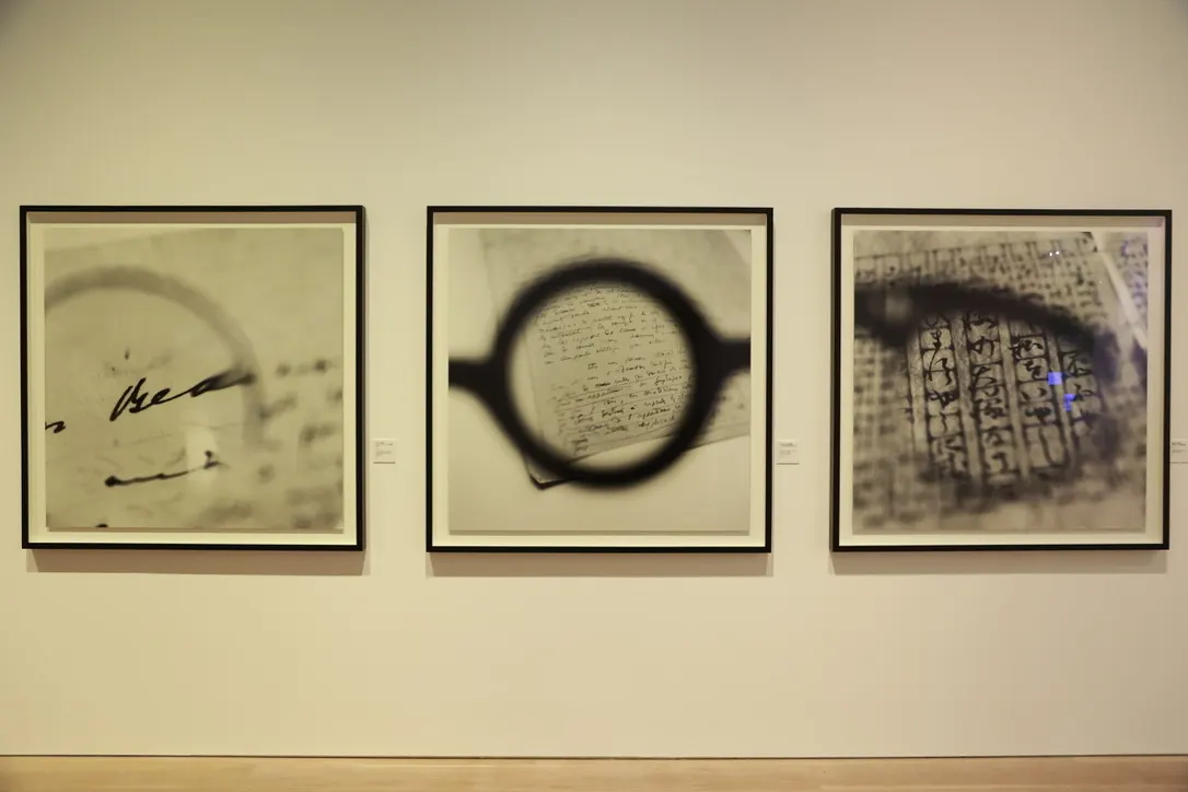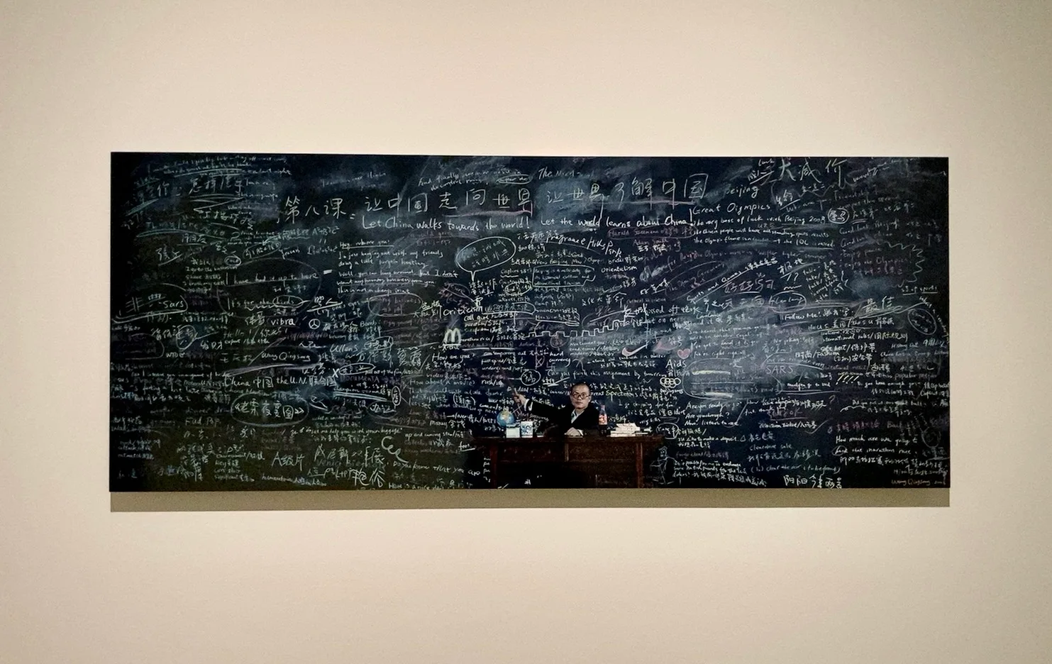 続いて、近現代の知識人が使った眼鏡にその文章や楽譜を組み合わせた米田知子の写真シリーズ「見えるものと見えないもののあいだ」(1998~)や、消滅した言語の音声記録を視覚化したスーザン・ヒラーの映像作品などを紹介する。本展のメインビジュアルになったワン・チンソン(王慶松)の《フォロー・ミー》(2003)は、巨大な黒板と教師役を思わせる作家本人を写した大型写真作品。英語と中国語による文言やスローガンで埋め尽くされた黒板は、マクドナルドやナイキなどのロゴも点在し、急速な欧米化を風刺する視点も感じさせる。