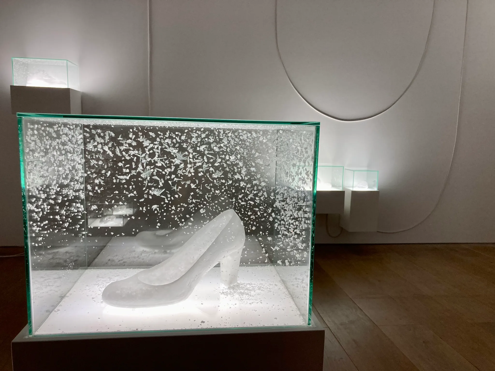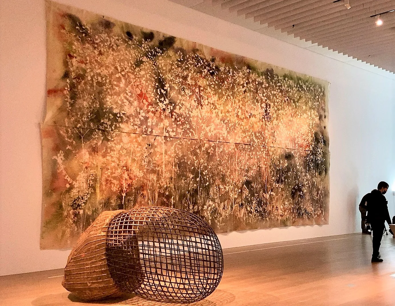 常温で気化するナフタリンを用いる宮永愛子は、新作《Root of Steps》を出品。ここ六本木に居住通勤する人の靴を模した複数の彫刻が、白く発光しながら一角に並ぶ。彫刻はやがて消えるが、微細な再結晶は残り、「見えなくてもその場に存在する」という作家のメッセージを伝える。梅津庸一の陶の作品群《黄昏の街》(2019-2021)、カンボジアのソピアップ・ピッチが手掛ける竹と籐製の大型オブジェは、伝統技法の更新によるコンセプチュアルな造形の可能性を感じさせた。