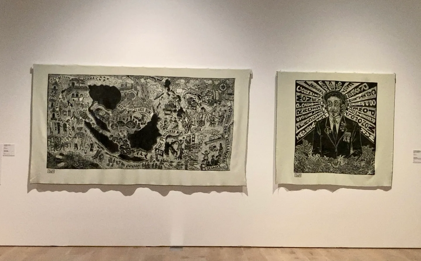 ここから正史が取りこぼした歴史や個人の物語にフォーカスした作品が続く。マレーシアのコレクティブ、パンクロック・スゥラップは、第二次大戦後に3ヶ国間で一時協議された連合体構想や、リーダーの苦衷をアイロニカルに表現した木版画を展示。横に並ぶ風間サチコの作品とともに、アジアの伝統的な媒体である木版画のパワフルな表現力を感じさせた。