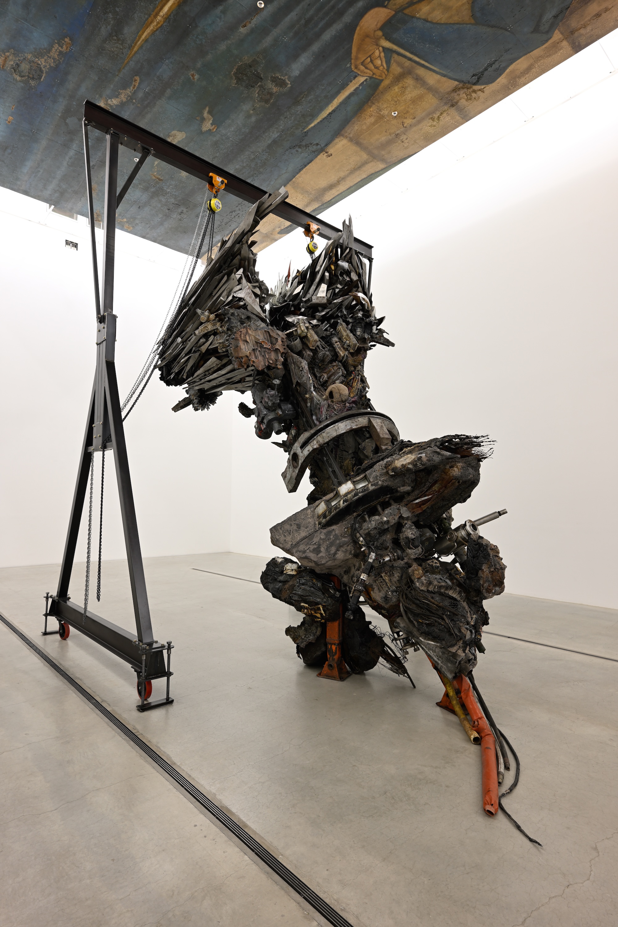 長谷川 アドリアン・ビシャル・ロハスの《想像力の果て》は「タイムエンジン」というアプリを使って、各時代の物質の重量、社会現象までシュミレーションして作られた彫刻です。人間でないものが作った時を旅する怪物のような彫刻。これは人間の想像力では絶対に作れないような、超絶的なデザインですね。驚くべきことに彼はバーチャルで作った彫刻を現実にダウンロードし始めました。それも産業廃棄物を使って。アルゼンチンのロサリオのスタジオでパーツを作ってから、ここで組み上げて彩色しました。設営に10日間以上かかっています。