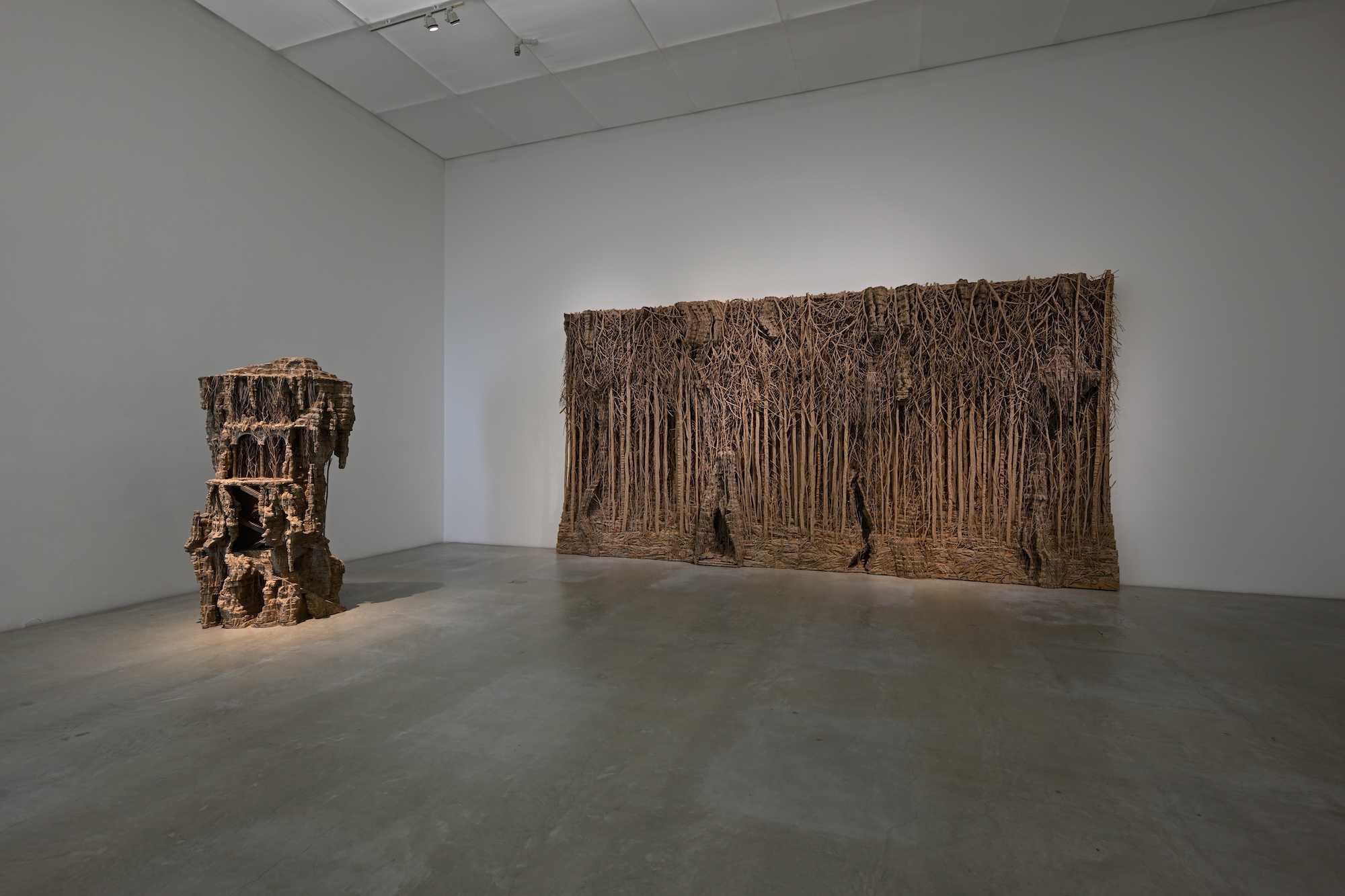 長谷川 では早速会場に入りましょう。エヴァ・ジョスパン《パラティンの森》です。彼女はダンボールを素材に森を作りますが、ディティールを見ていくと樹木や洞穴が合わさっていて没入感がある。「森があらゆるものを呑み込んでいく」と彼女は言います。よく見ると全部リューターやカッターで作っていて、クラフトの枠には収まらない驚異的な創造力を感じます。また、パースペクティブを刺激する奥行きを感じられるのもポイントです。「ものの表層」ではなく、その奥へ誘う感覚を呼び起こします。