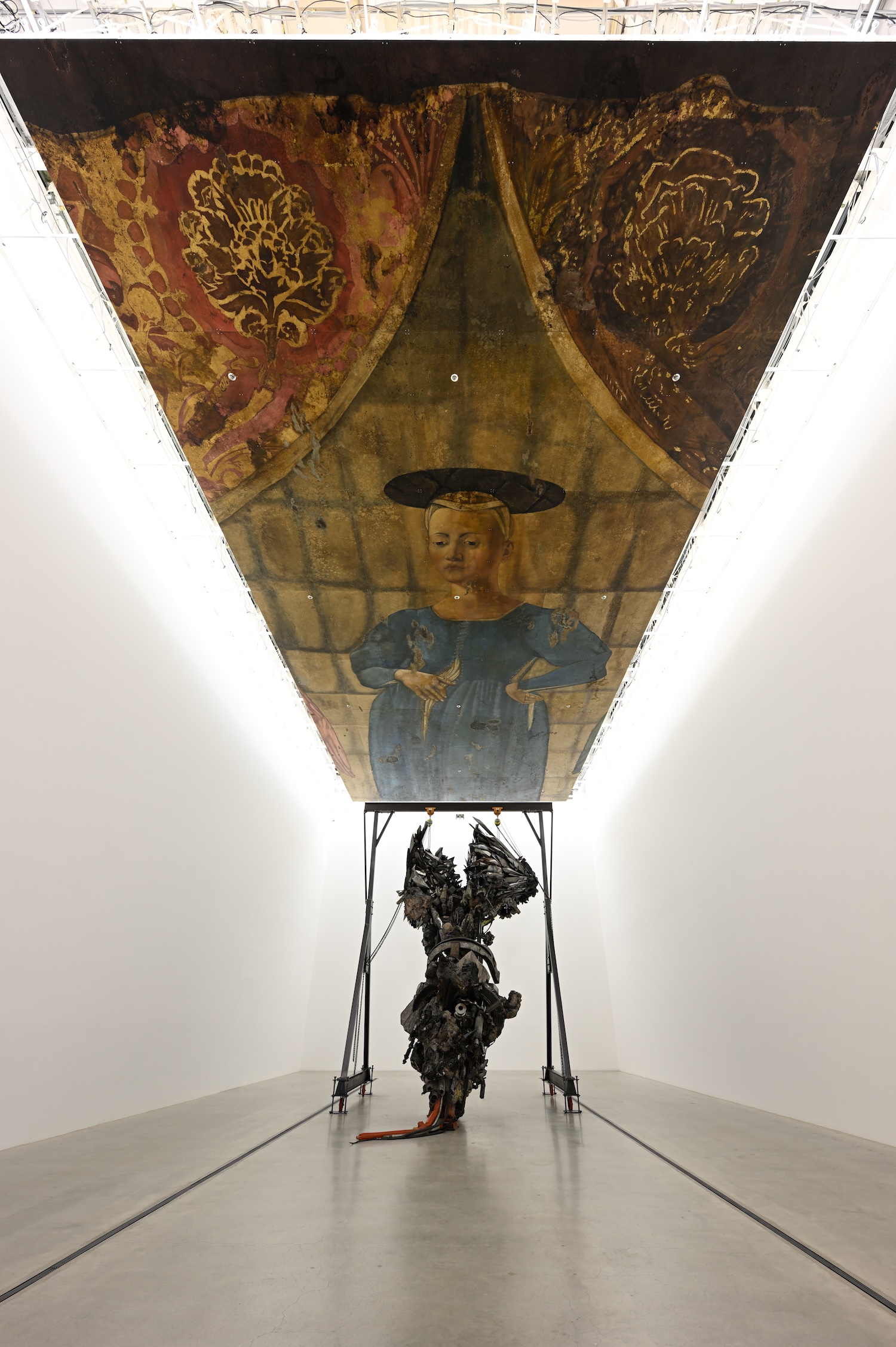 天井にある《消失のシアター》は15世紀のピエロ・デ・ラ・フランチェスカの絵画「出産の聖母」を作家自身が超拡大模写した複製画。能登半島地震の被災後、下見に来た最初の作家が彼です。天井のガラスが一部落下した状態の展示室を見て「僕はここに住む人たちのために天井にこの作品を展示したい」と言いました。元々はオーストリアのクンストハウスブレゲンツの床に置いて展示したもので、それを天井に設置するには作品に穴を開ける必要があったのですが、それでも構わないと。彫刻の下に立つと、穴からちょうどマドンナの顔が見える。ここまで綿密な展示にするために1年弱ずっと考えてくれました。すごい情熱ですよね。