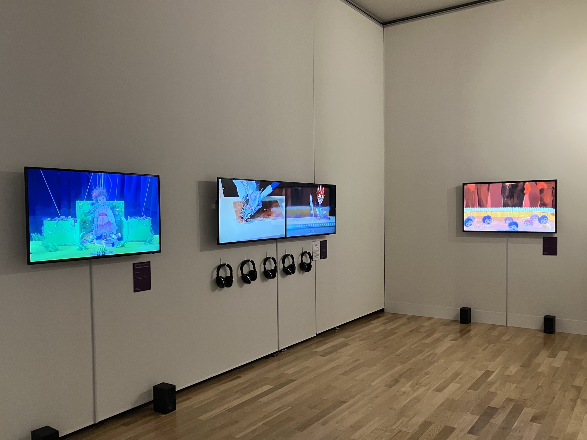 展示構成において、ひとつのキーワードになっているのが「人形」だ。2011年から制作されている笹岡の映像作品には目や口など自身の顔のパーツが使われたキャラクターや、自身が演じるキャラクターが登場する。そして編集や合成の際に生じるノイズやバグなどをあえて残し、絵画における筆の跡や絵具のたまりのような、人の手の痕跡を感じさせる独自の映像世界を作り出している。