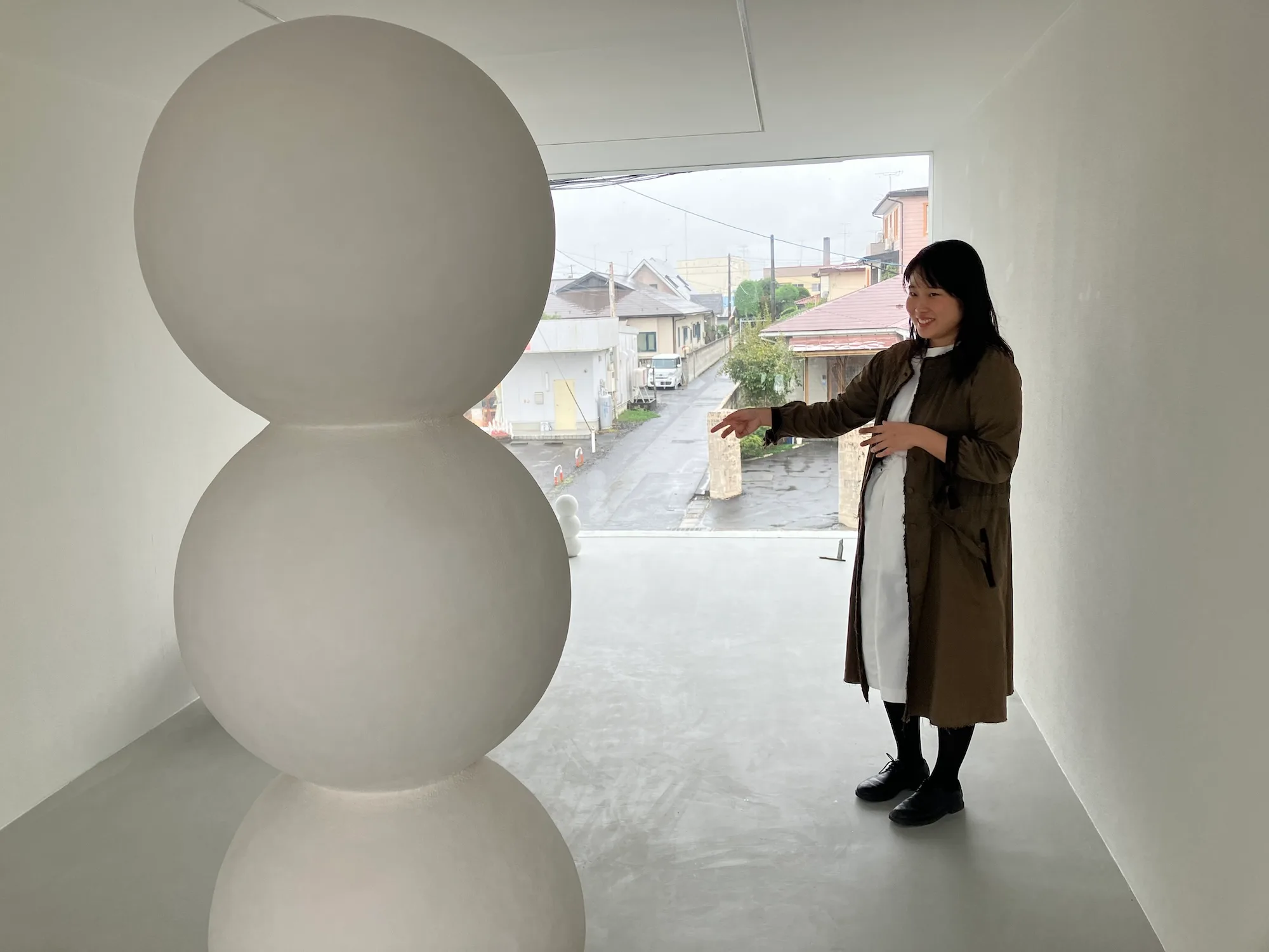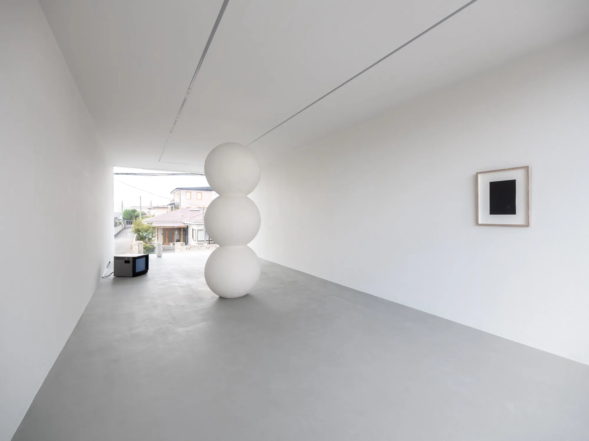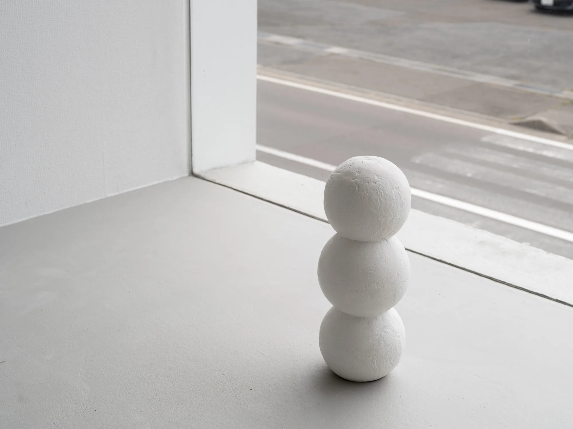 展示室に入り、まず視界に飛び込んでくるのは中央に置かれた高さ2m近くの彫刻作品《Q》(2024)だろう。雪だるまのように大きな白い球体が3つ積み上げられている。展示室の大きなガラス窓が道路に面しているため、来場者の多くは、まず外からこの作品を目にするかもしれない。