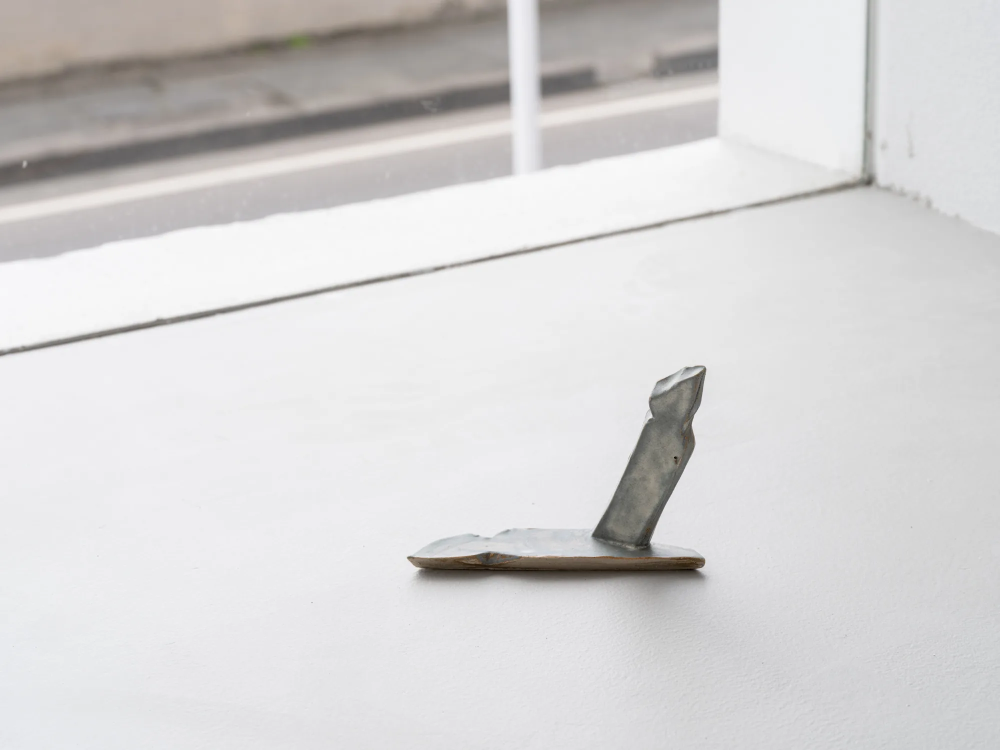 窓際に置かれた陶磁器の彫刻は、かつて時計としても利用された蝋燭をモチーフにした《Shadow of Candle》(2023)。時間を凍結させるかように作られた「燃え尽きることのない蝋燭」とその影、そして彫刻作品が置かれる際にしばしば「ないもの」として鑑賞される台座が、すべて同じ素材で等価なものとして表現されている。晴れた日には作陶された影に加えて、太陽光が作る本物の影も浮かび上がる。