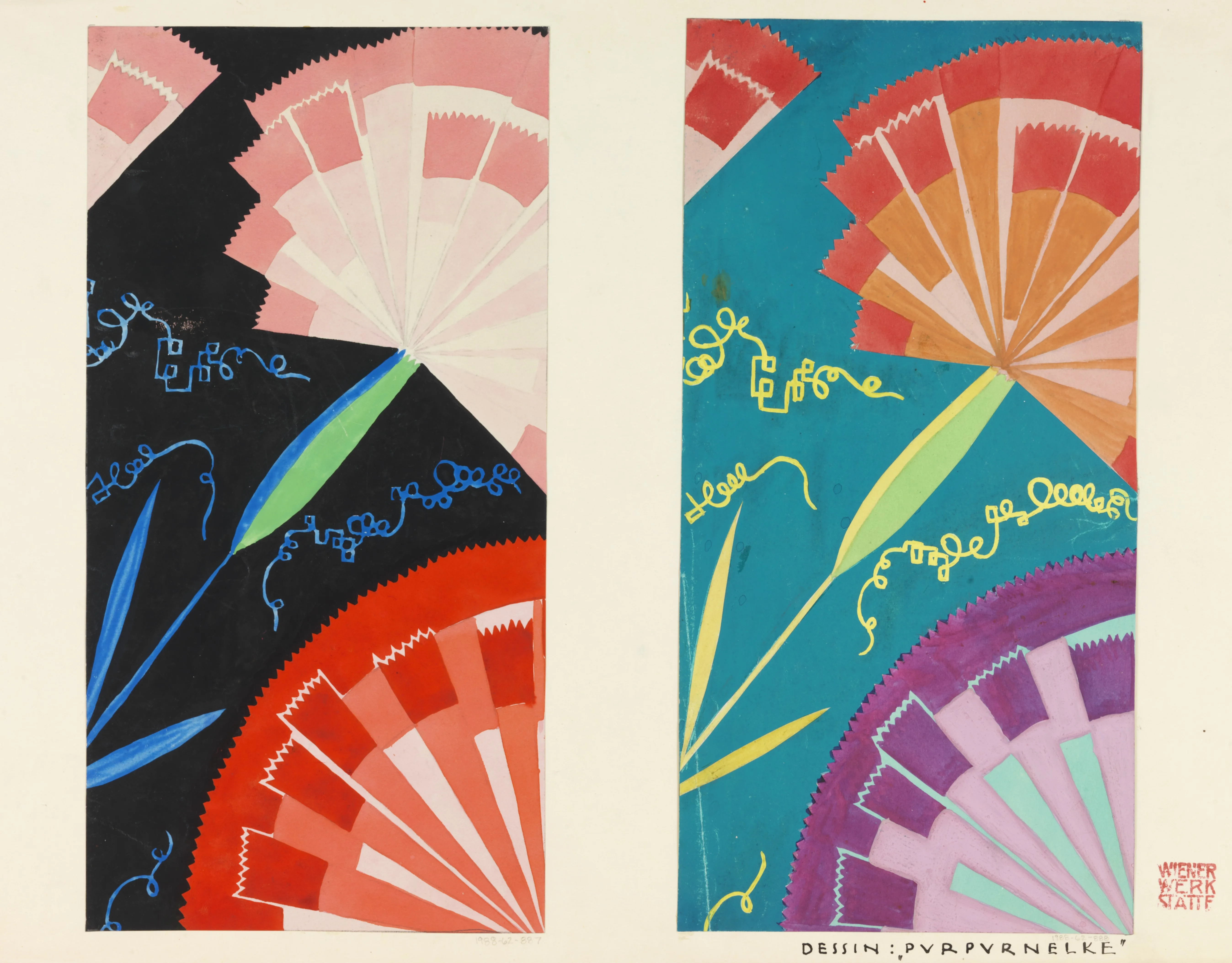 Rix-Ueno was born in Vienna and enrolled at the prestigious Vienna School of Arts and Crafts (now University of Applied Arts Vienna) in 1912. She studied textile arts, cloisonné, and sculpture, as well as taught by the architect Josef Hoffmann, who founded the Vienna Workshop (Wiener Werkstätte) in 1903 together with the graphic designer and painter Koloman Moser and the entrepreneur Fritz Waerndorfer. The Vienna Workshop gathered influential architects, artists, designers, and artisans working in ceramics, silver, fashion, furniture, and the graphic arts. Evolving from the Vienna Secession (a progressive alliance of artists and designers established in 1897), this studio was considered a pioneer of modern design in Europe. After graduation, Rix-Ueno joined the Workshop as part of the second generation of designers dedicated to decorative, high-quality craftsmanship in utilitarian items inspired by “the rich tradition of the glorious past.” However, she broke away from the studio’s conventional use of straight lines and suppressed colors and developed her own aesthetic, focusing on organic curves, colorful and sophisticated patterns, and objects that visualized familiar motifs such as flowers, birds, animals, and candies. She rendered her designs in soft lines, geometric shapes, and elegant shades. Most of all, she emphasized the concept of “fantasy.” For her, it meant “being unaffected by others, demonstrating imagination, and gaining originality.” The exhibition is based on this same ideology.