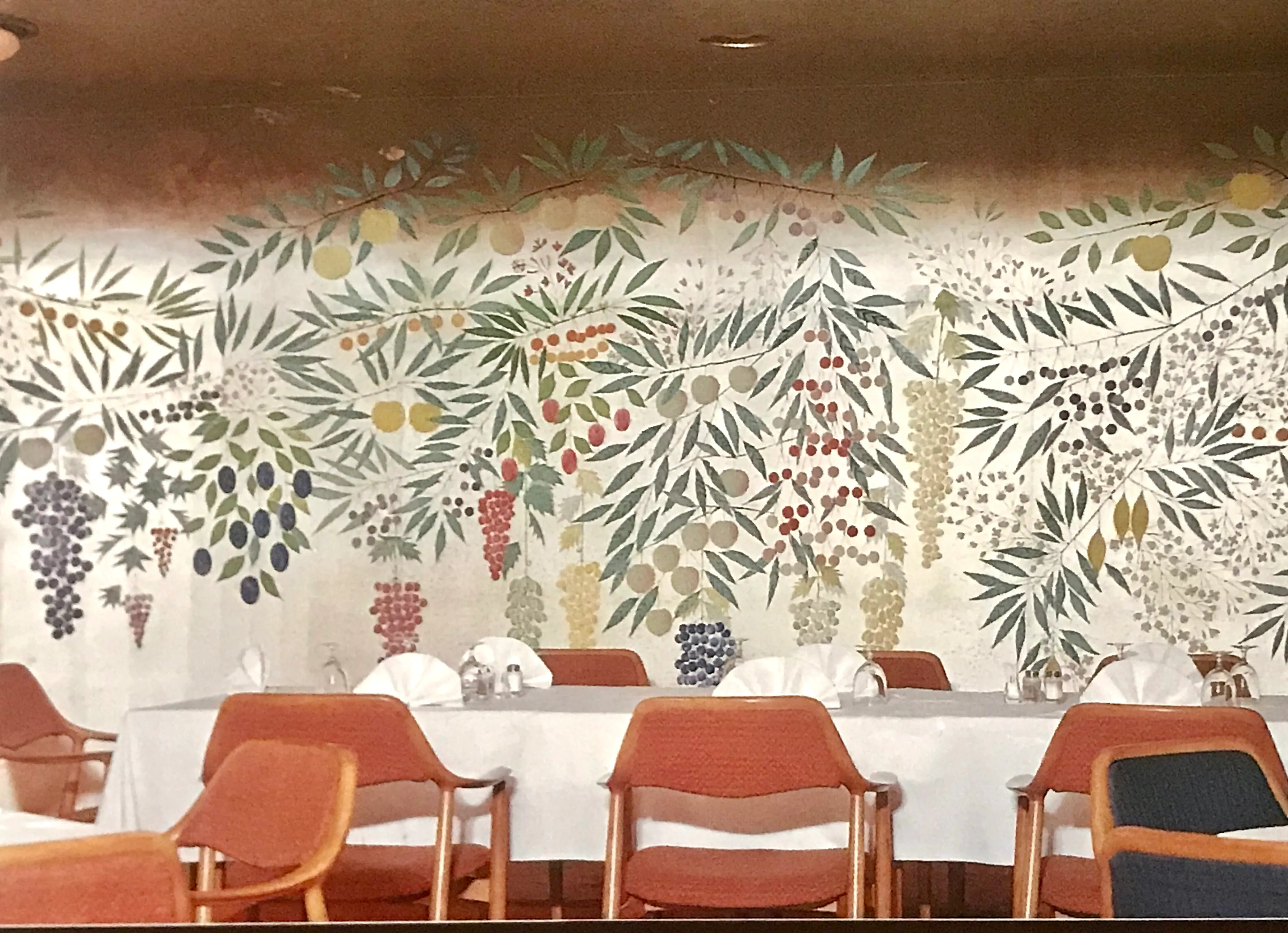Among Rix-Ueno's celebrated interior works, the mural for the former restaurant Actress at Nissay Theatre in Hibiya is absolutely exquisite. Togo Murano, the architect for Nissay Theatre, commissioned Rix-Ueno to decorate the restaurant's interior. Together with four of her best students, she produced about 350 paintings for a fantastic work filled with fruits, birds, and flowers that dance across aluminum foil-coated paper covering over 300 square meters. The silver background was later changed by protective material to gold, conveying a luxurious appearance reminiscent of the Rimpa style. Due to renovations, the Actress mural (except for some parts that could not be taken down) was removed in 2005. It is now stored at the University Art Museum, Kyoto City University of Arts.