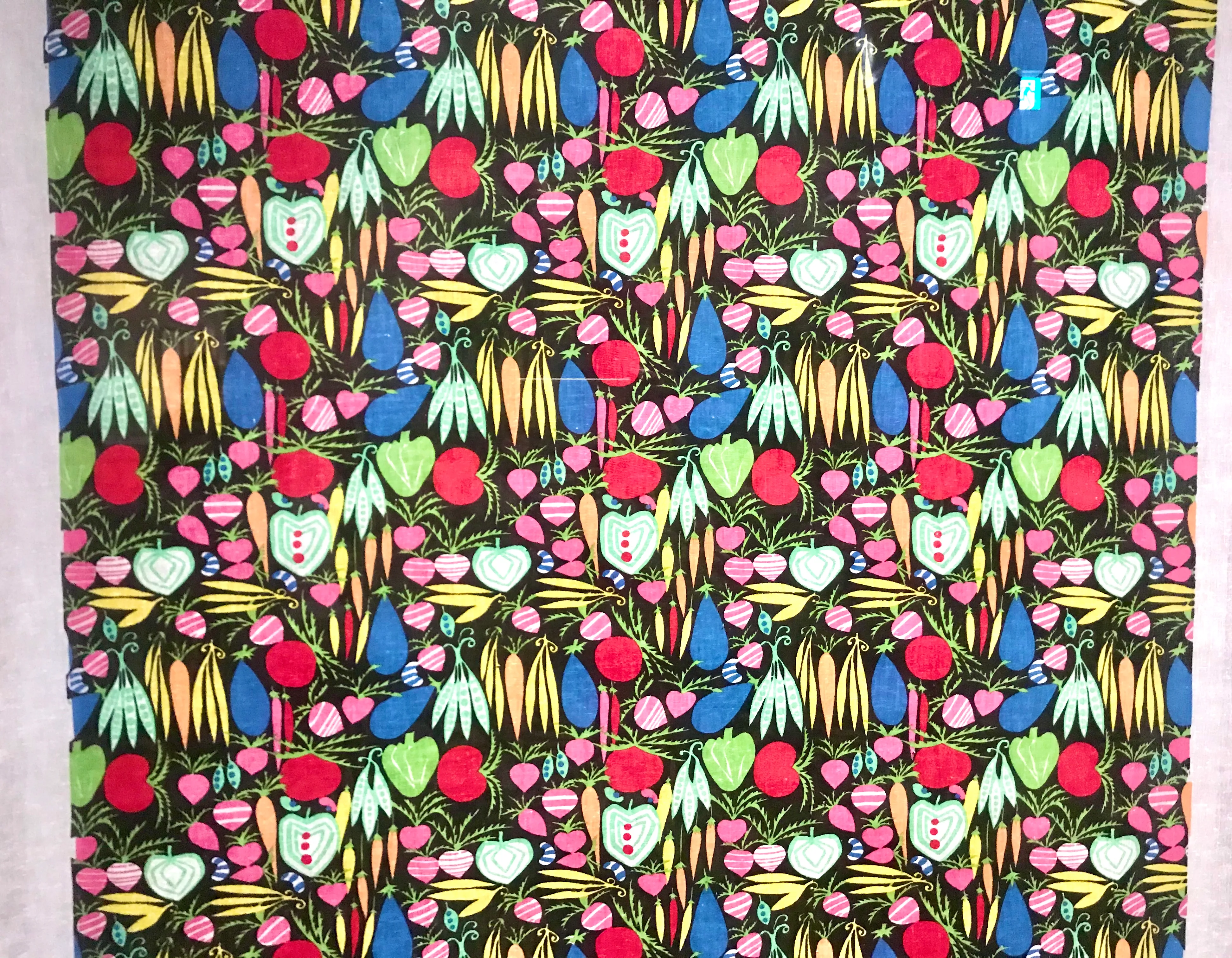 Designs such as Printed Textile [Vegetables] (1955) and Printed Textile [Sweet Pea] (1955), used on flowing cotton and satin fabrics, demonstrate Rix-Ueno’s astute artistry in expressing vibrant colors and rhythmical themes. In the first work, a lively arrangement of tomatoes, eggplants, peppers, carrots, and peas are studded on a black background, exuding energy and strength. She conveys a similarly positive energy in Printed Dress-Fabric Design “Bonbons” (2) (1925–35). Candies and chocolates are drawn with gentle curves and straight lines, without use of a ruler. They seem to move busily, as if mingling and chatting with each other.
