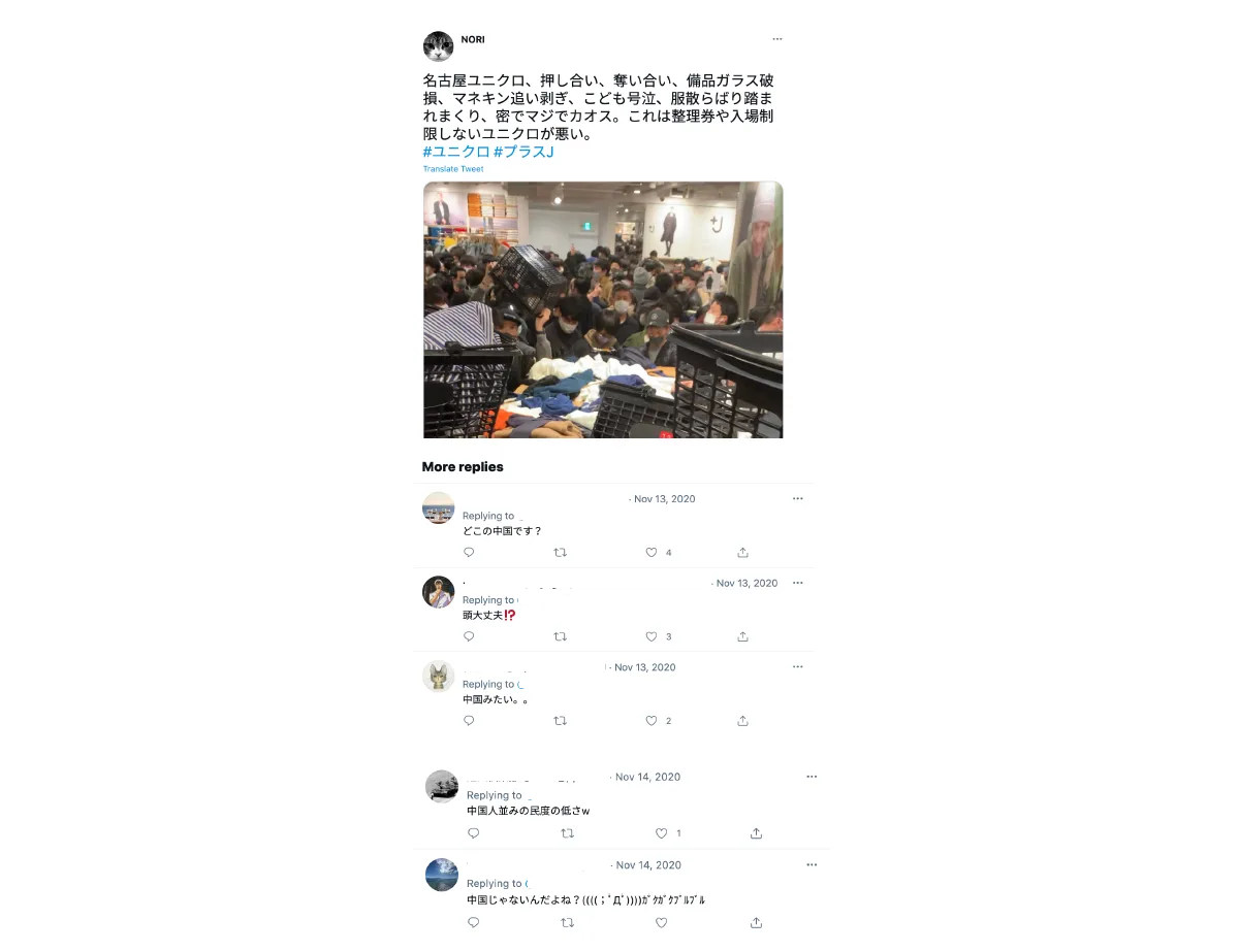 On the internet I will often witness casually racist and xenophobic tweets and comments by Japanese people. For example, when the highly coveted +J collection (Jil Sander’s collaboration with Uniqlo) came out in the fall of 2020, chaos erupted in many stores with people scrambling to grab products, which caused a buzz online. With these tweets came racist remarks by Japanese people commenting that these shoppers were “acting as low as the Chinese.”
