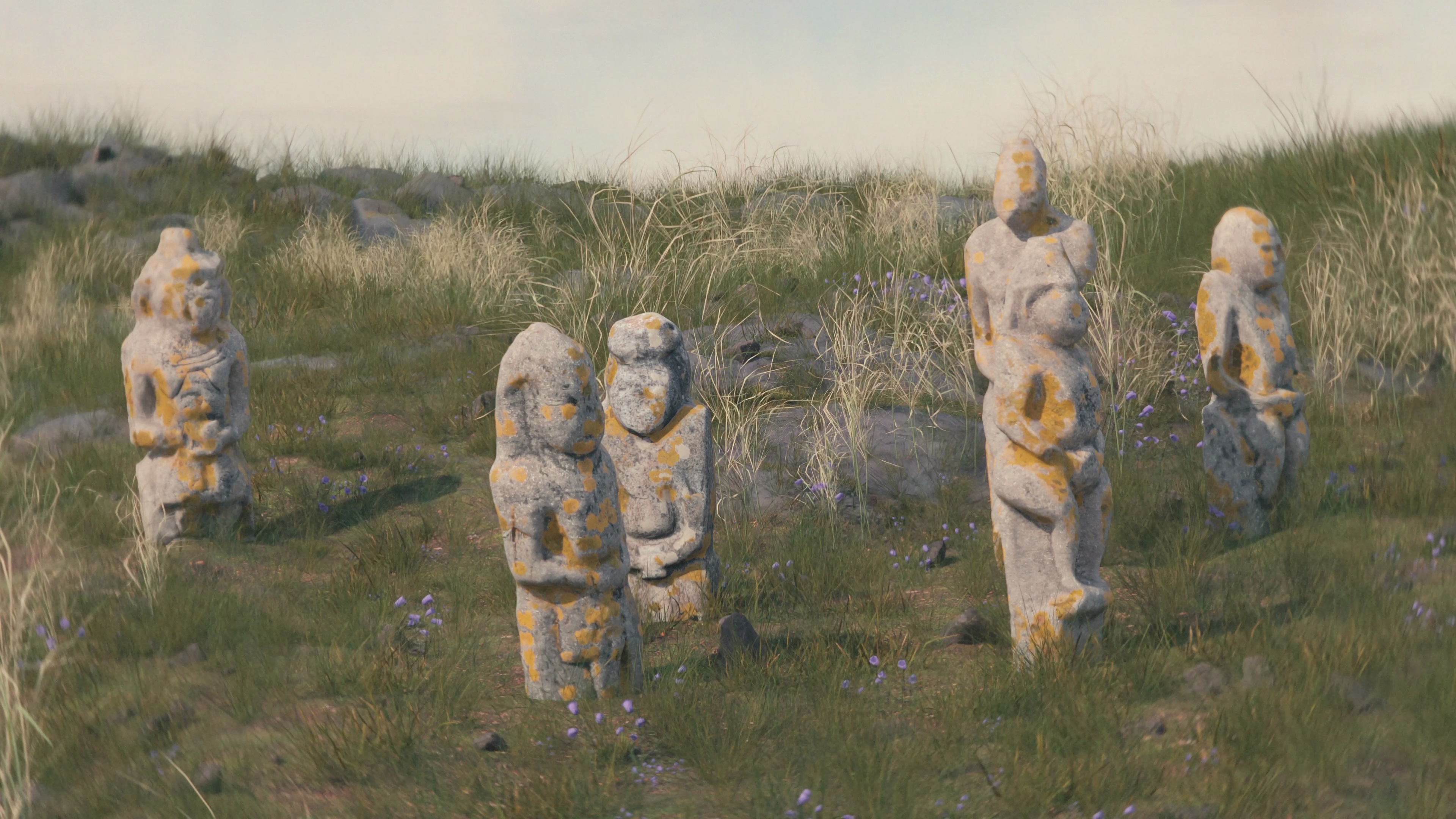 By encapsulating grief in stone or other materials that endure time, the seeming expiration date of sorrow and grief gets sidelined. Not only can we find these examples within architectural modes, but we can also recognize the refusal to submit to the lack of time for grief in art. I feel that the work After Time (2024) by Polina Davydenko is a beautiful intersection of memorial sculpture and contemporary art, exemplifying how material culture can hold stories of loss and grief that can long outlive us. In the film, we see six stone sculptures in a changing environment. They are located in a field, but soon this changes to a landscape filled with snow, then a hurlwind of flames follows. The sculptures, or so-called ‘babbas’, are personifications of ancestors that were crafted to help the deceased cross from the world of the living to the land of the dead. The sculptures can be found in Izium, a city in Ukraine. Against a backdrop of the changing seasons, Davydenko exemplifies the ongoing wait for a war that is seemingly never-ending. It points to the persistence of grief, how it can stick with us over the passing of time, through the seasons of our lives. The war has brought a lot of destruction and loss to Davydenko’s country. These baba’sーstone sculpturesーact like silent observers of this. Their materiality ensures their long-lasting presence in this world; however, their existence is also not guaranteed.