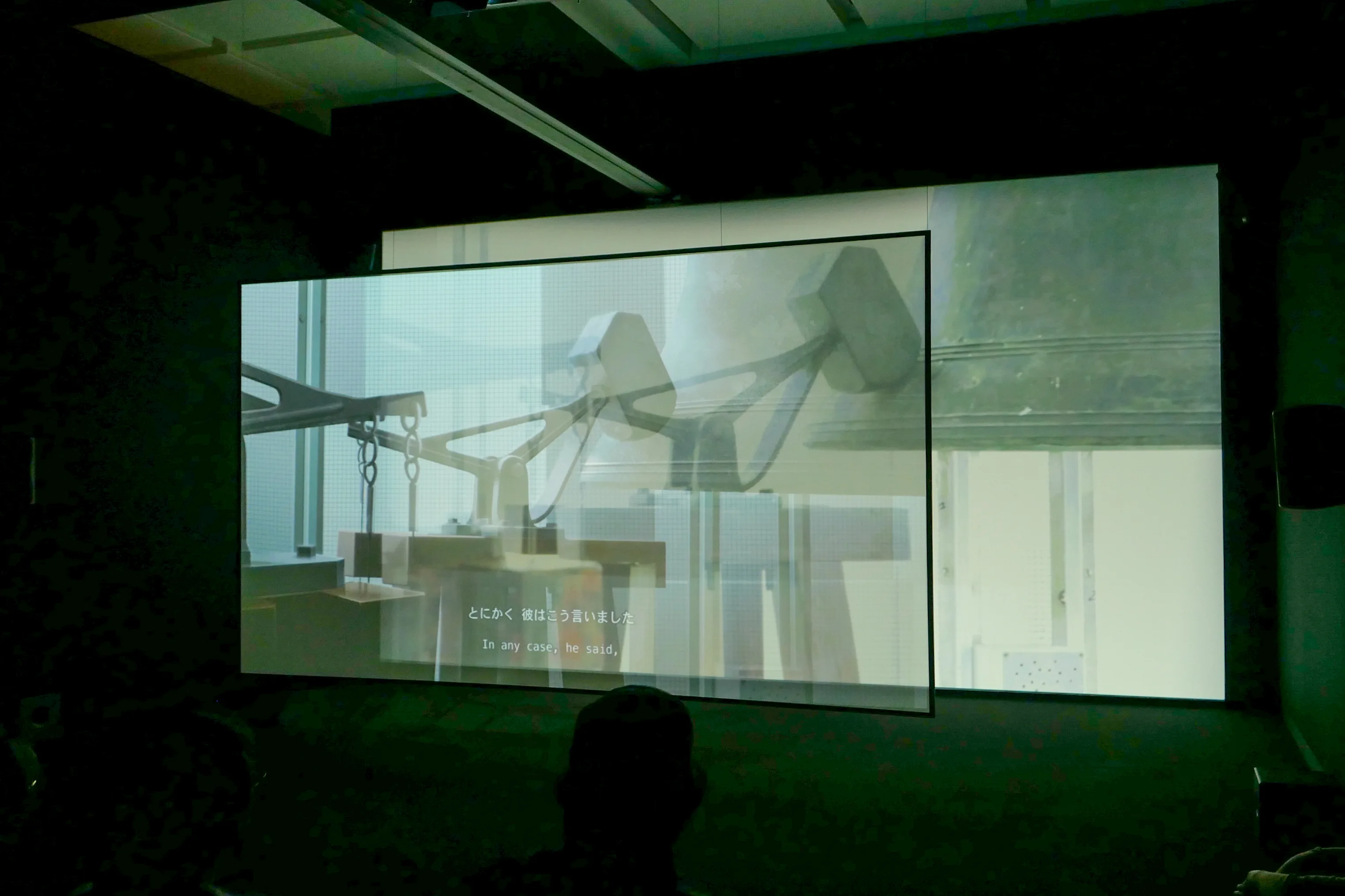 ——This also creates a different relationship between the audience and the text, isn't it? The audience pays attention not only to the visual aspect of the monitors but also to the sound and the written words, trying to understand them.