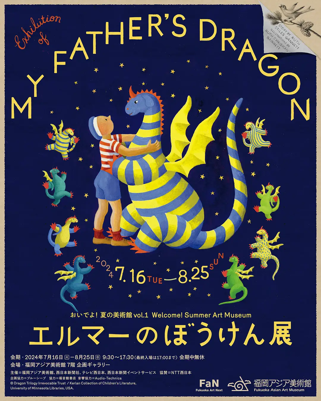 My Father's Dragon is the story of a boy named Elmer who embarks on a journey to rescue a baby dragon trapped on Wild Island. This exhibition showcases over 130 valuable original drawings and dummy books created over 70 years ago. Additionally, to enjoy Elmer's adventures within the exhibition space, four interactive displays will allow visitors to immerse themselves in the world of the picture books.