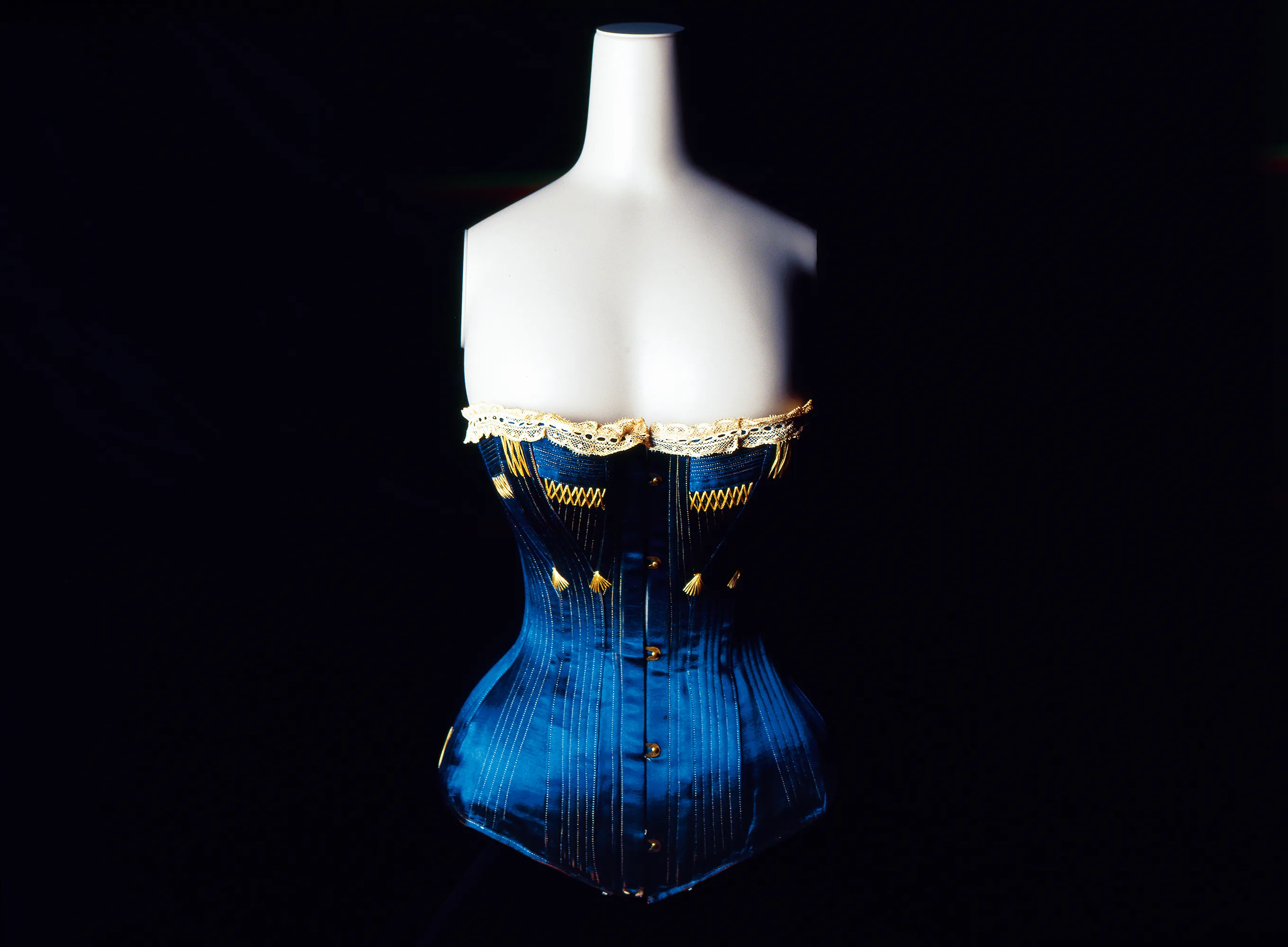 Centuries ago, European fashion was dictated by an almost obsessive desire for slender waists. The body had to be distorted forcibly to attain an idealized figure and the corset, typically worn by upper class women, became the fashionable solution for squeezing the torso. It was traditionally made of whalebone, then iron in the 16th century. Corset (1880s) is an elegant cobalt blue creation with gold threads and tassels.