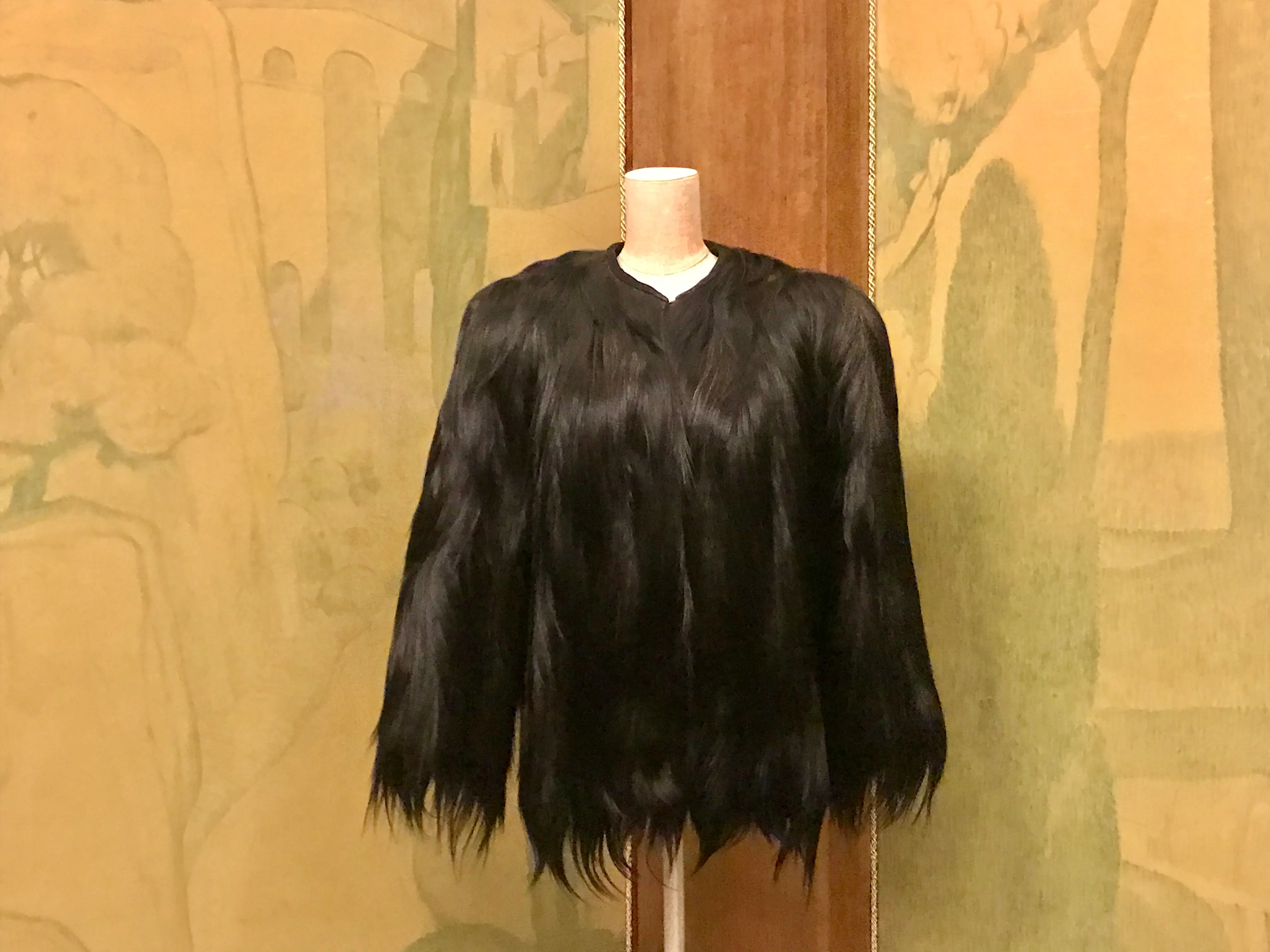 In the first section, “Favoring the Organic,” the astounding Jacket from the 1930s is made of black ape hair by George Kines. Monkey fur, prevalent in the rainforests of Africa, was used to decorate clothing in the 1920s. Its popularity as a material for coats and jackets evolved into the 1930s. Meanwhile, tree and plant fibers have been woven into clothes throughout history. Belgian designer Jan Fabre is famous for creating garments made of jewel beetles and insect wings. His Hals Pantser (1996-2002) featured on the exhibition poster is a stupendous piece of artistic fashion that applies iron netting to jewel beetle wings.