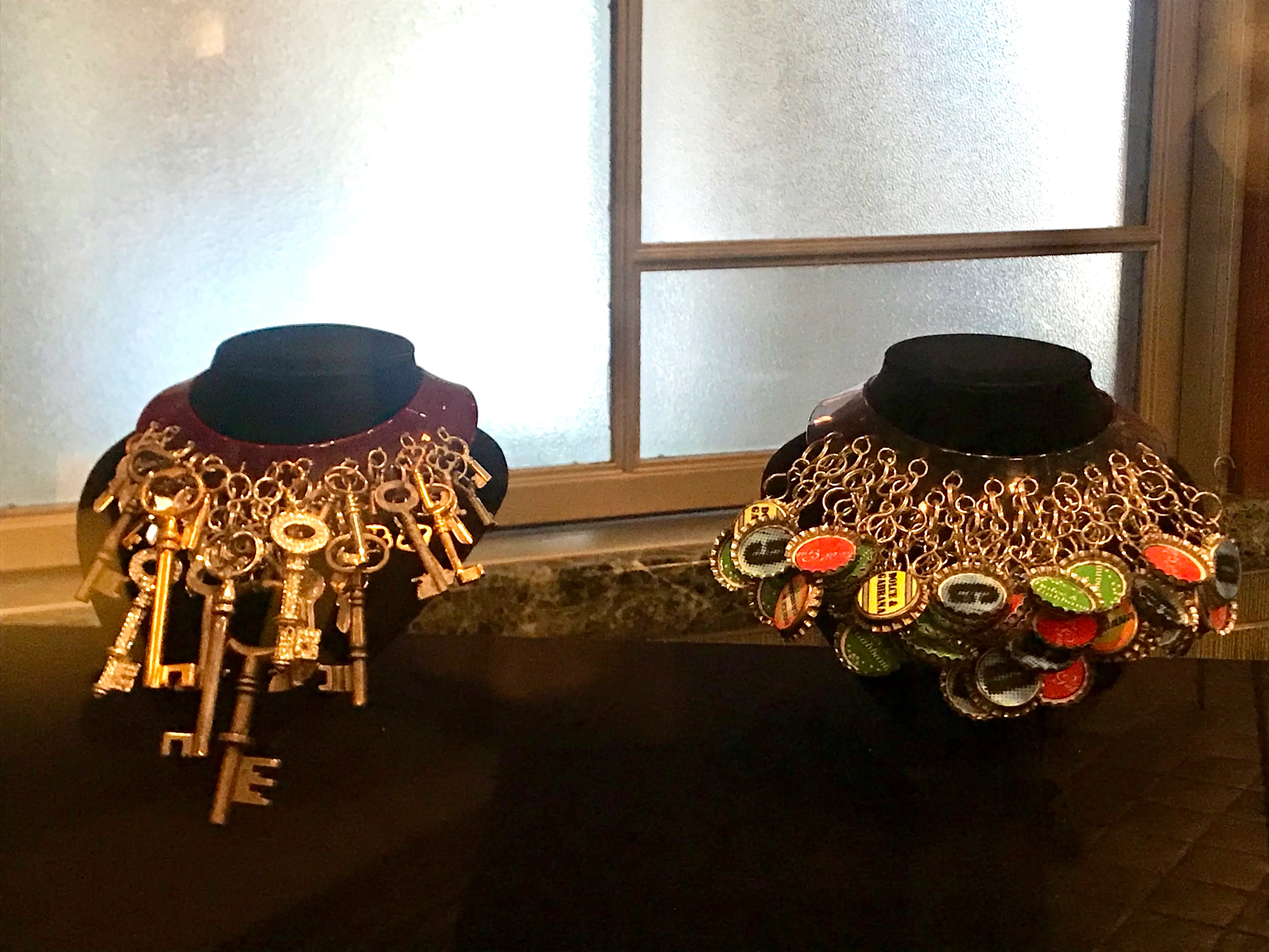 Surrealism in jewelry was introduced by the likes of Max Ernst, Alexander Calder, and Jean Dubuffet, who created lively sculptural pieces like brooches and necklaces. Martin Margiela’s distinctive Necklace set (2006) is made from gold-plated wooden frames with hinges—an unusual choice of materials that categorizes the work as “abstract jewelry.” Dolce & Gabbana also displays items from its peculiar series Necklace (2005–2006). One piece features antique keys and the other colorful bottle caps made of plastic and brass.